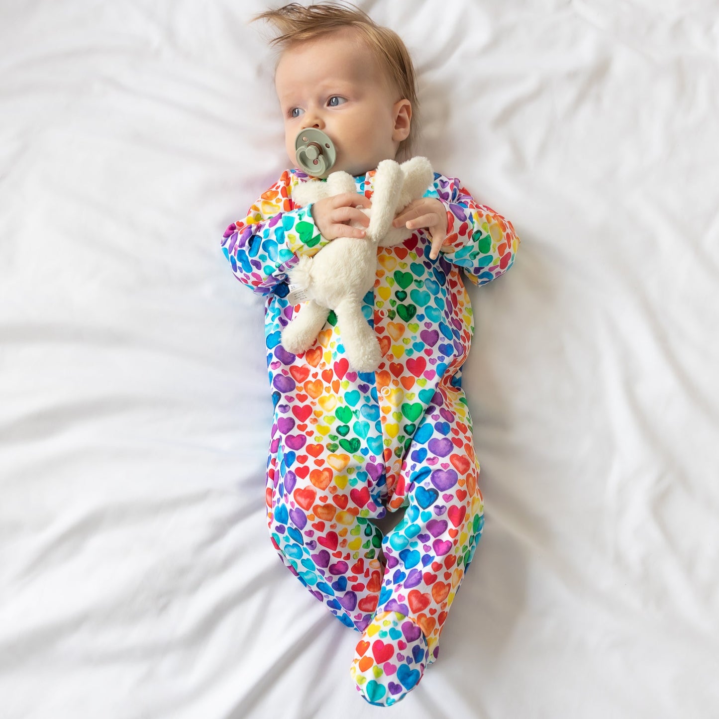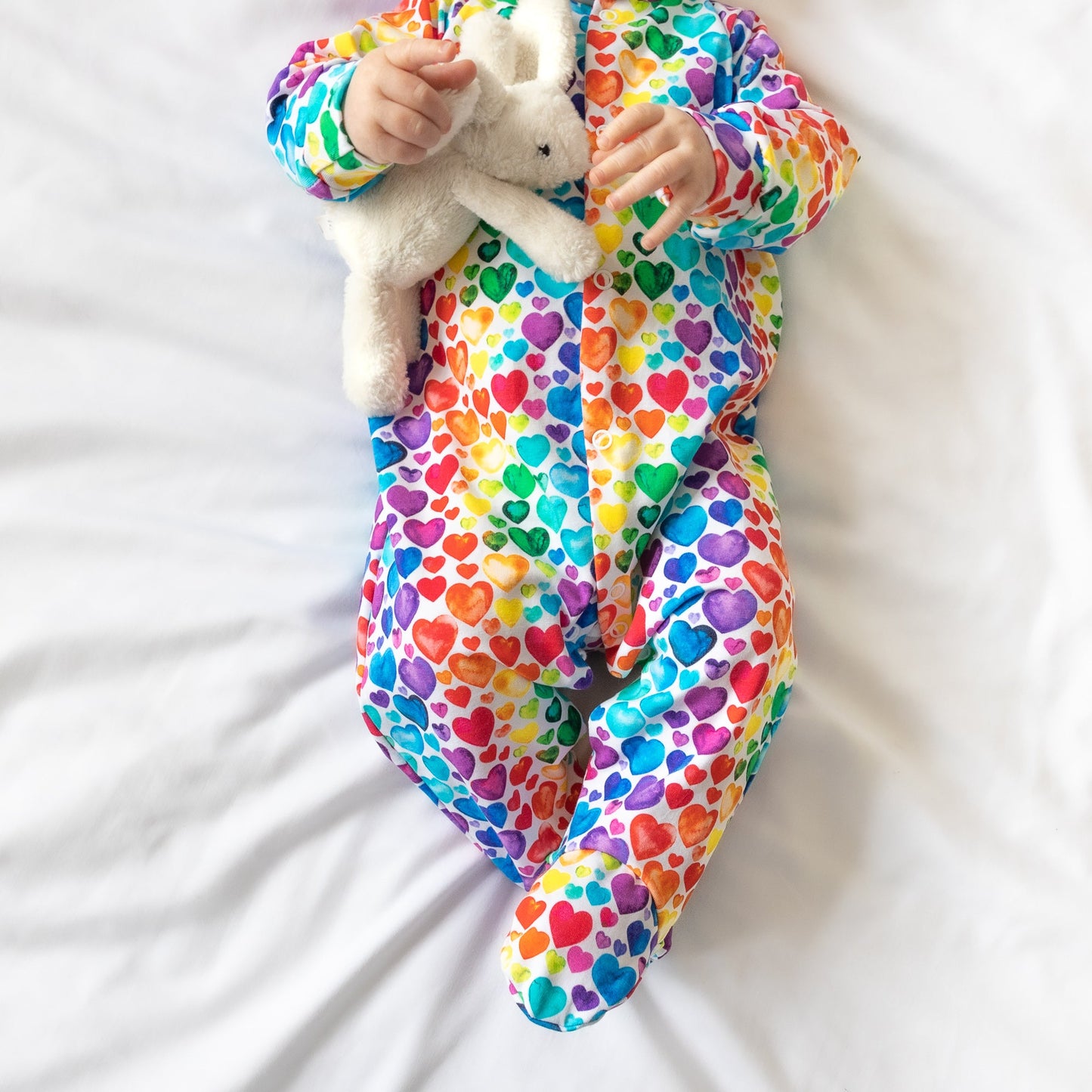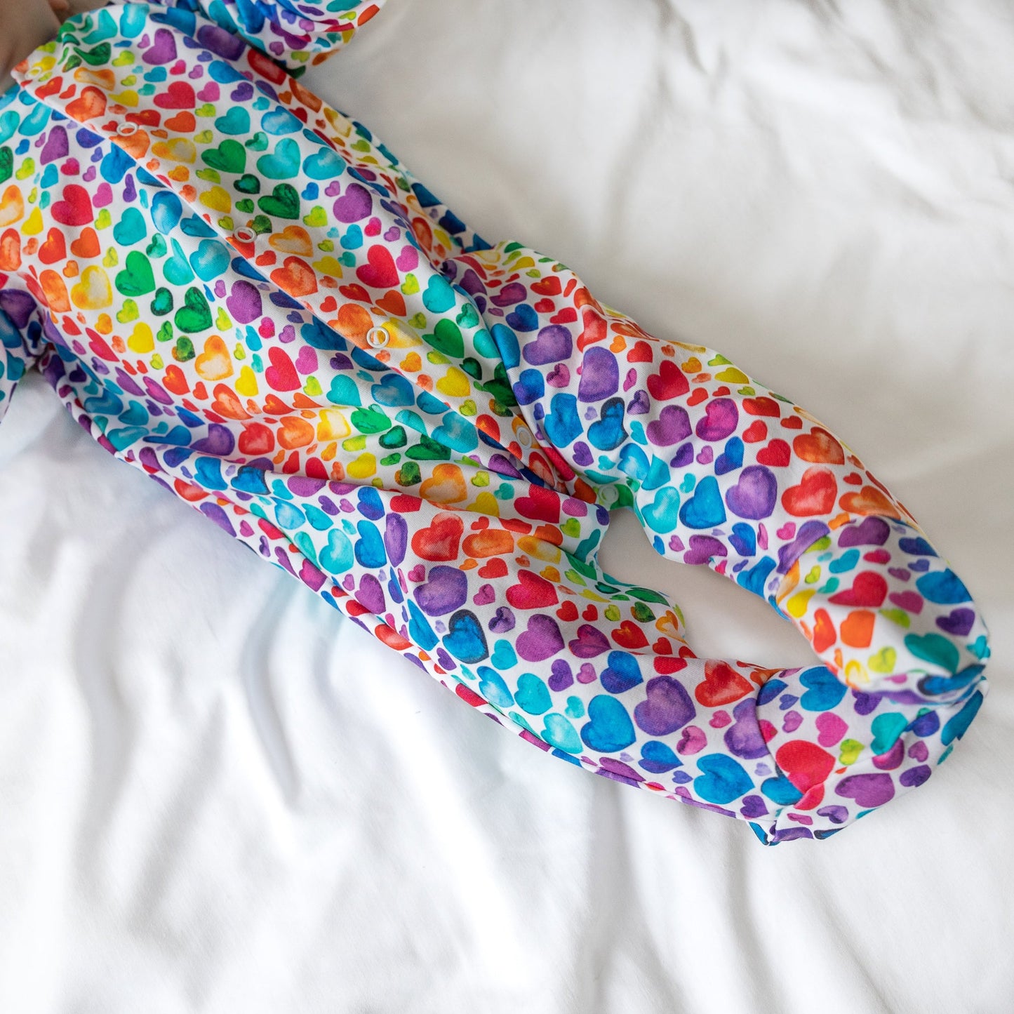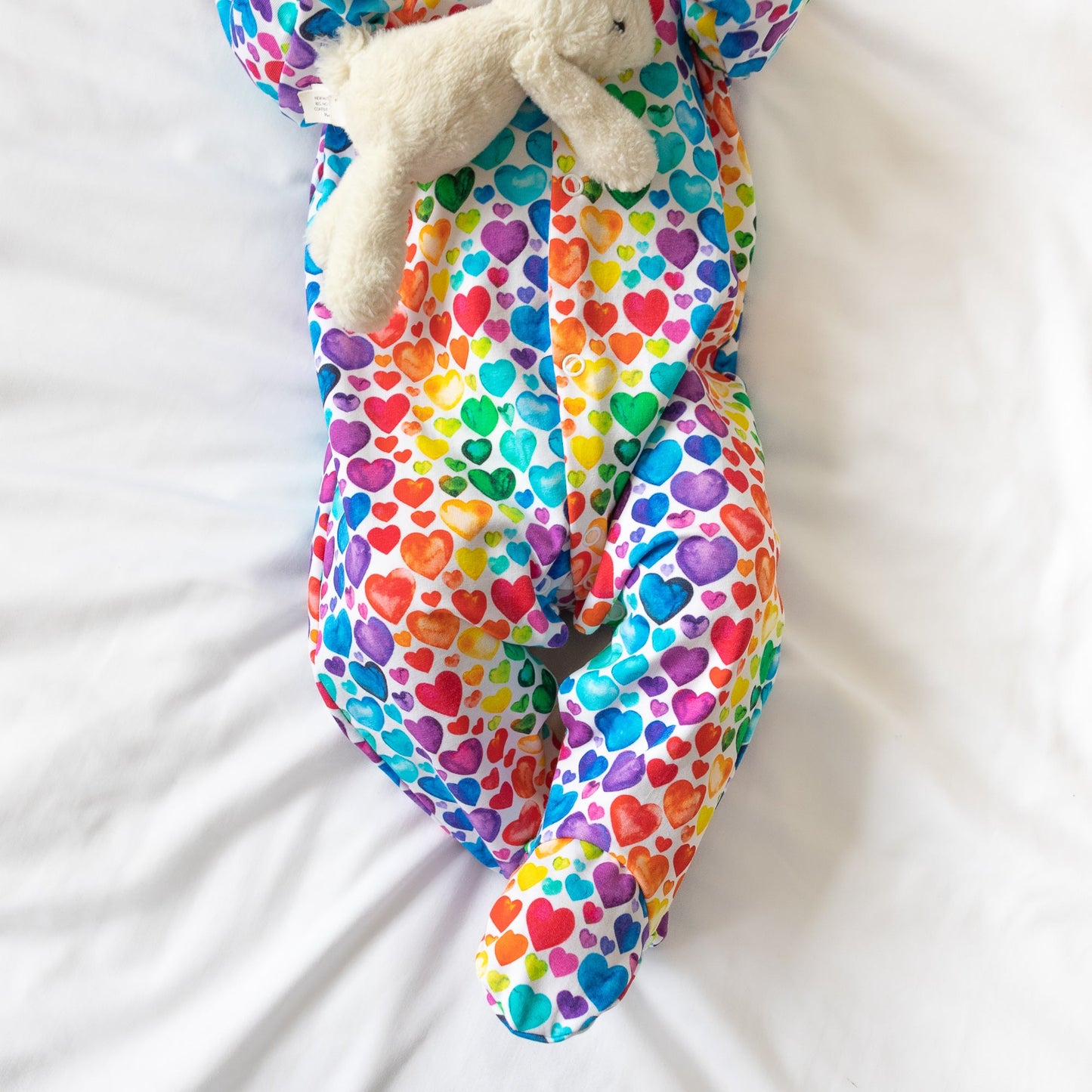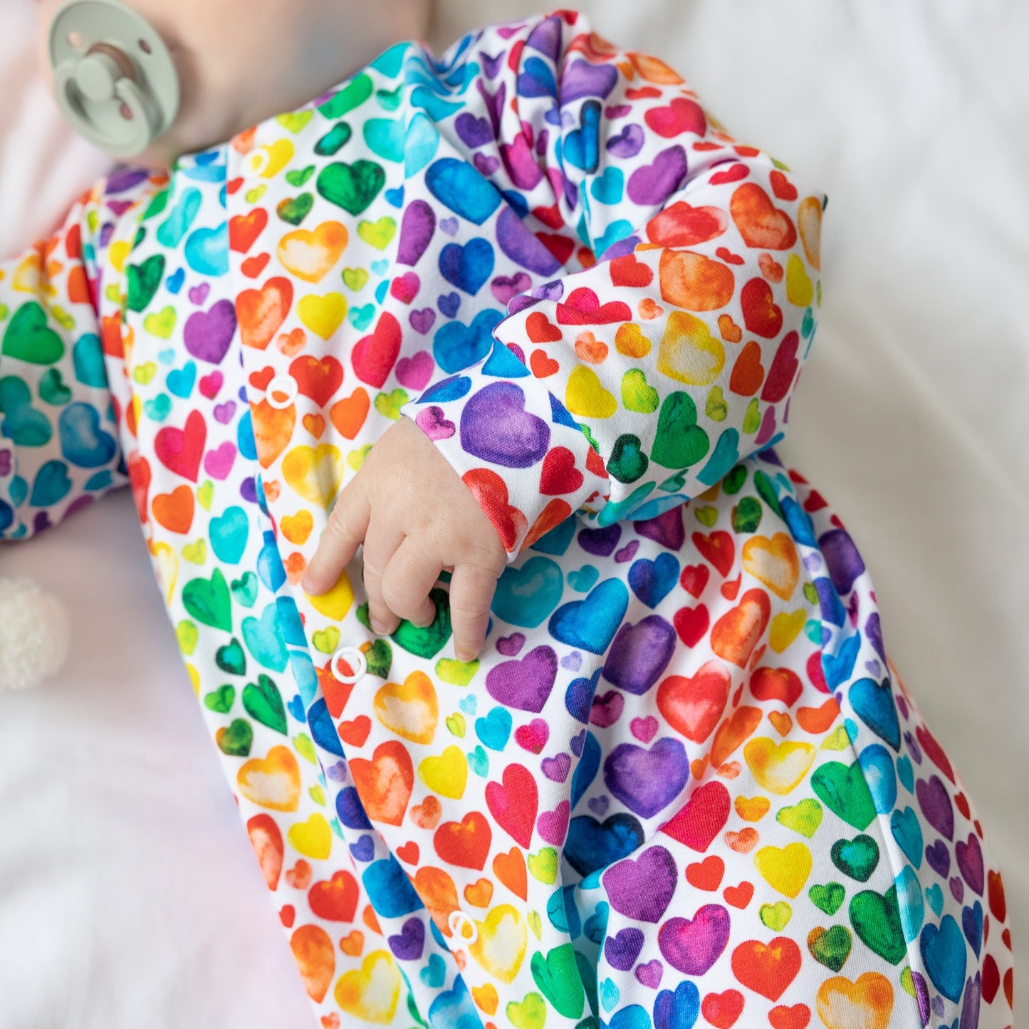 Our new and gorgeous Rainbow heart print sleep suit is the perfect one-piece for any baby.