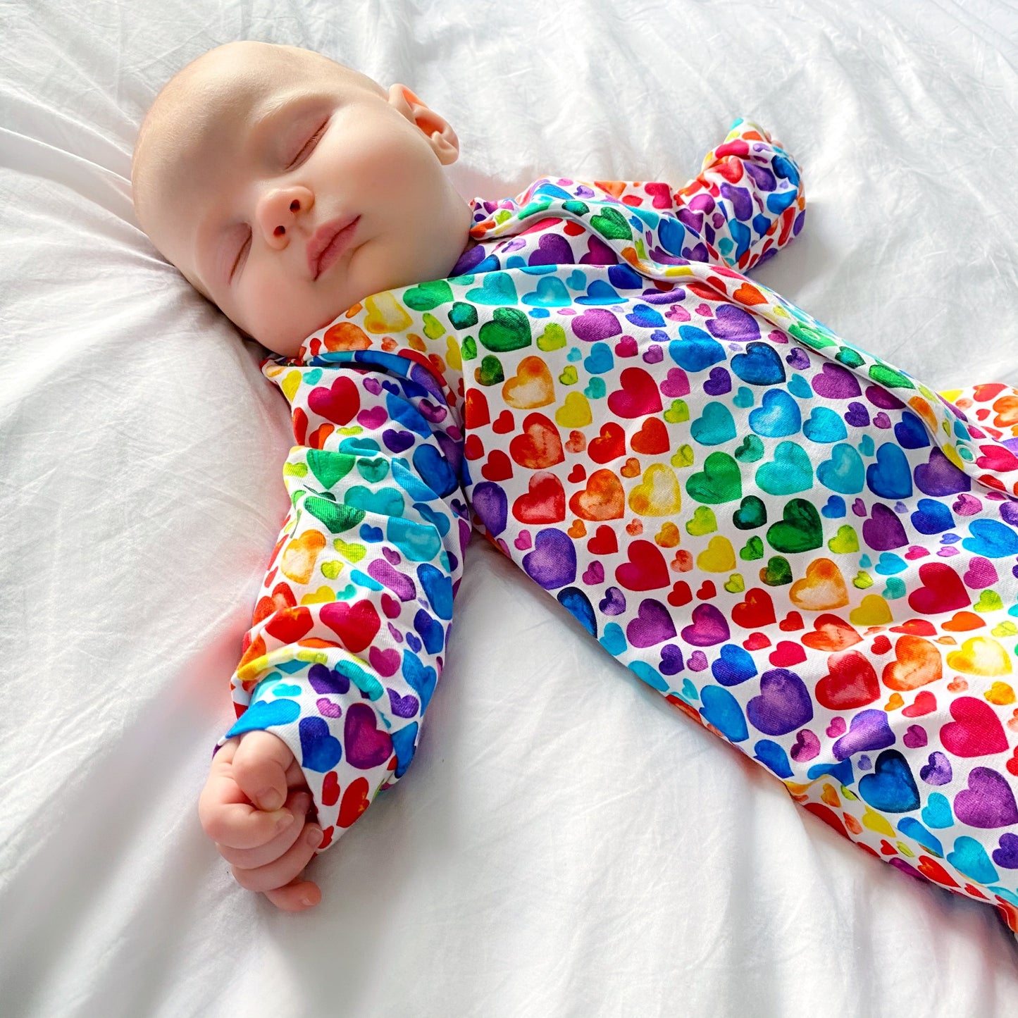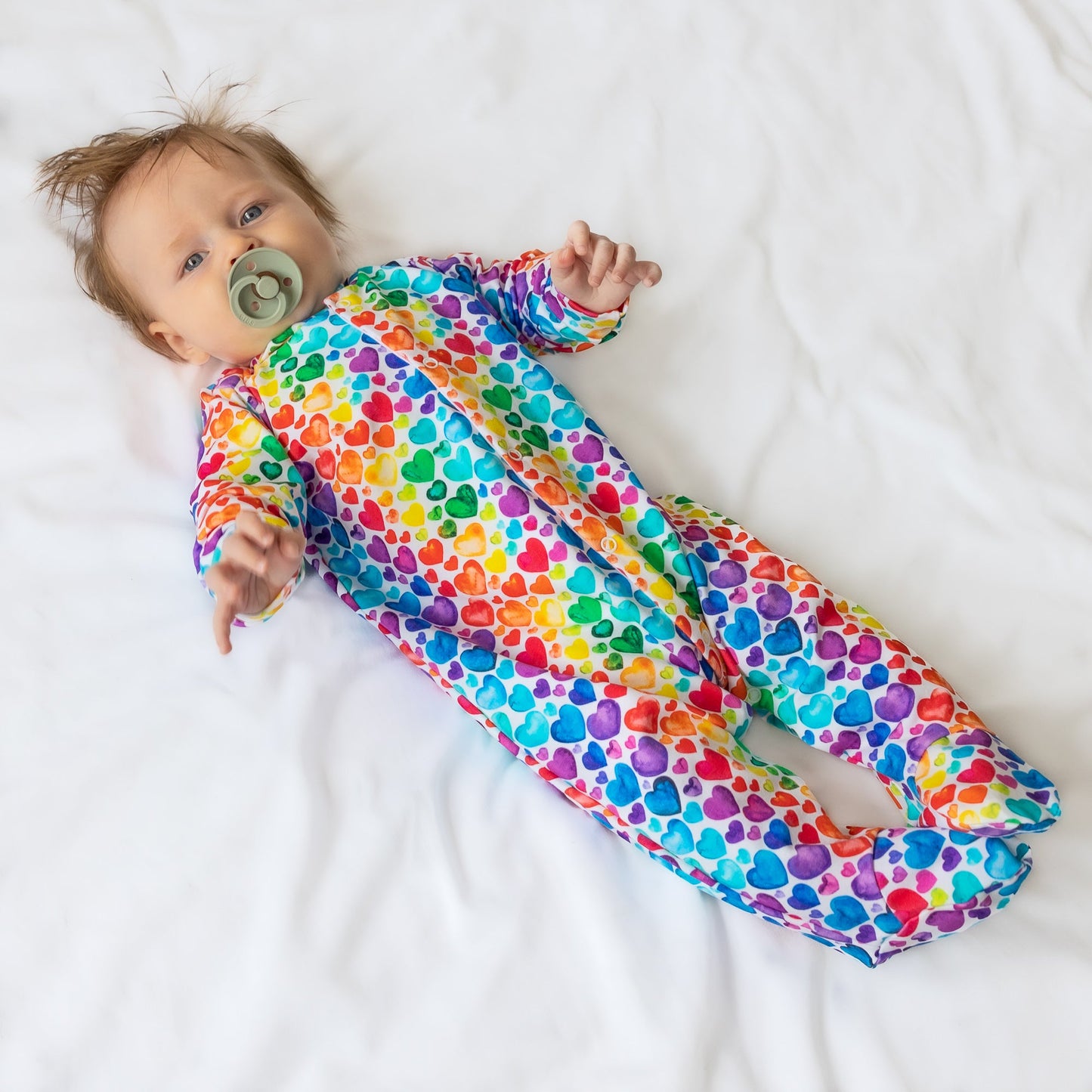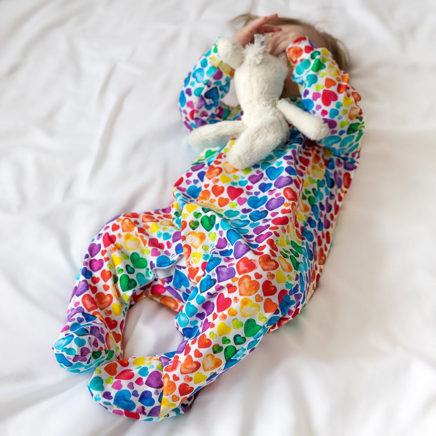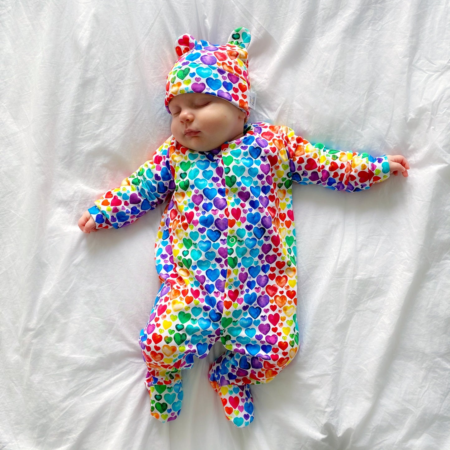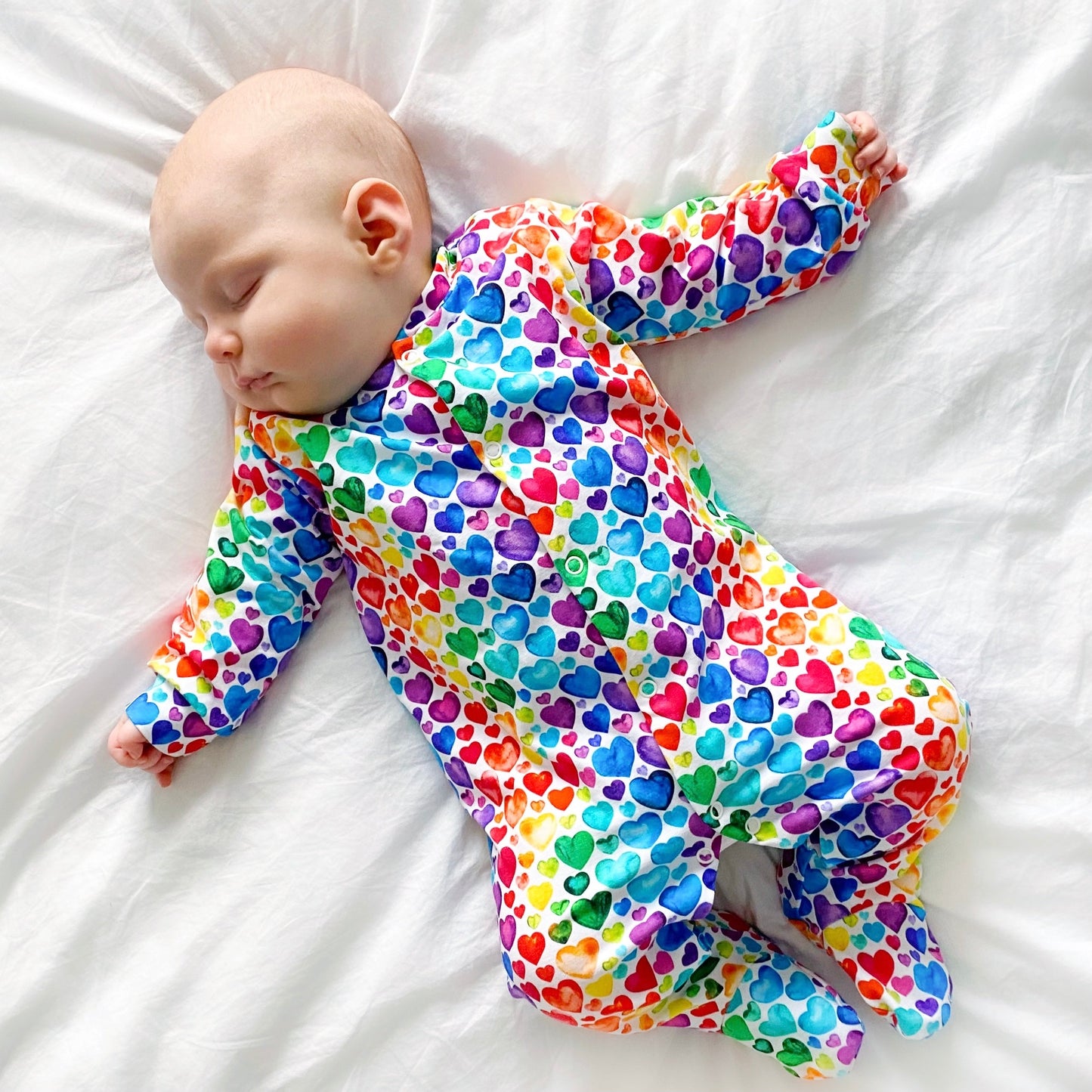 Our new and gorgeous Rainbow heart print sleep suit is the perfect one-piece for any baby.