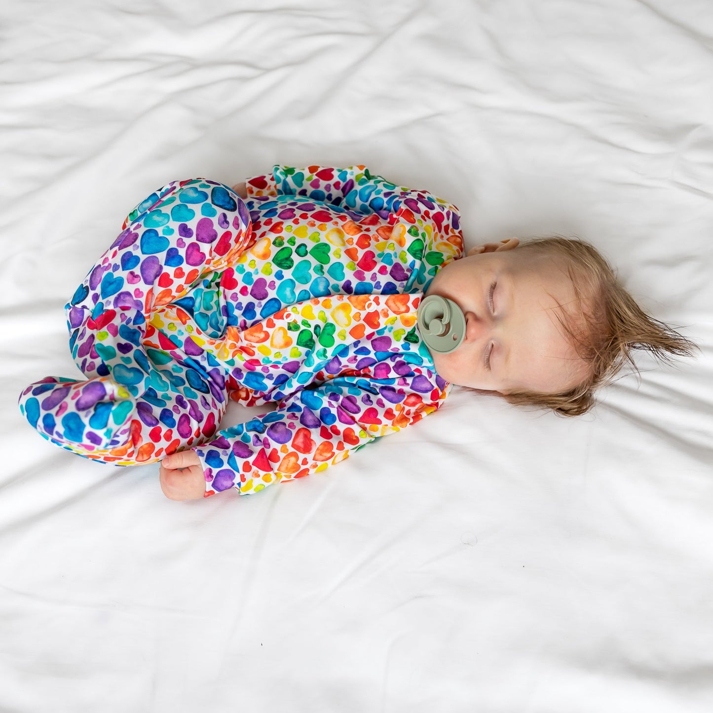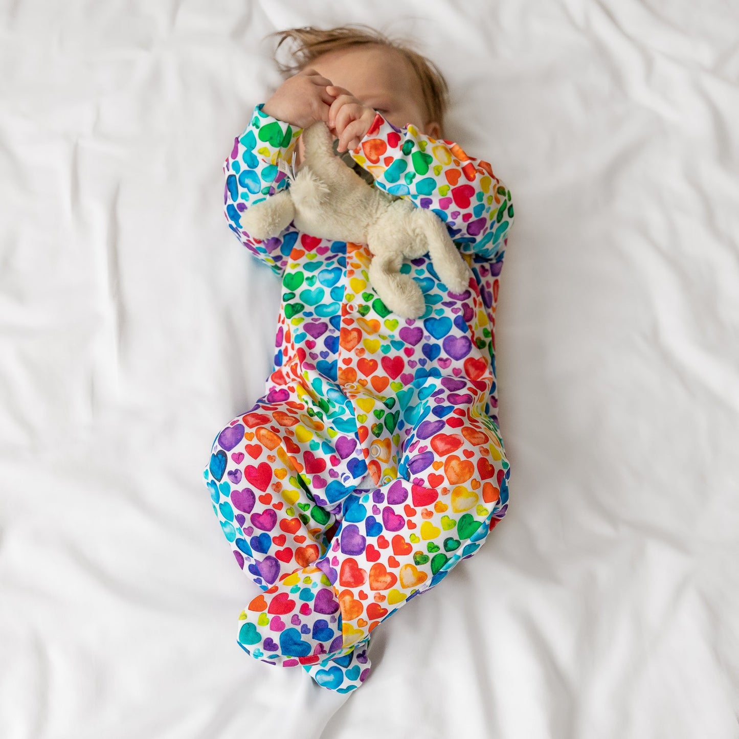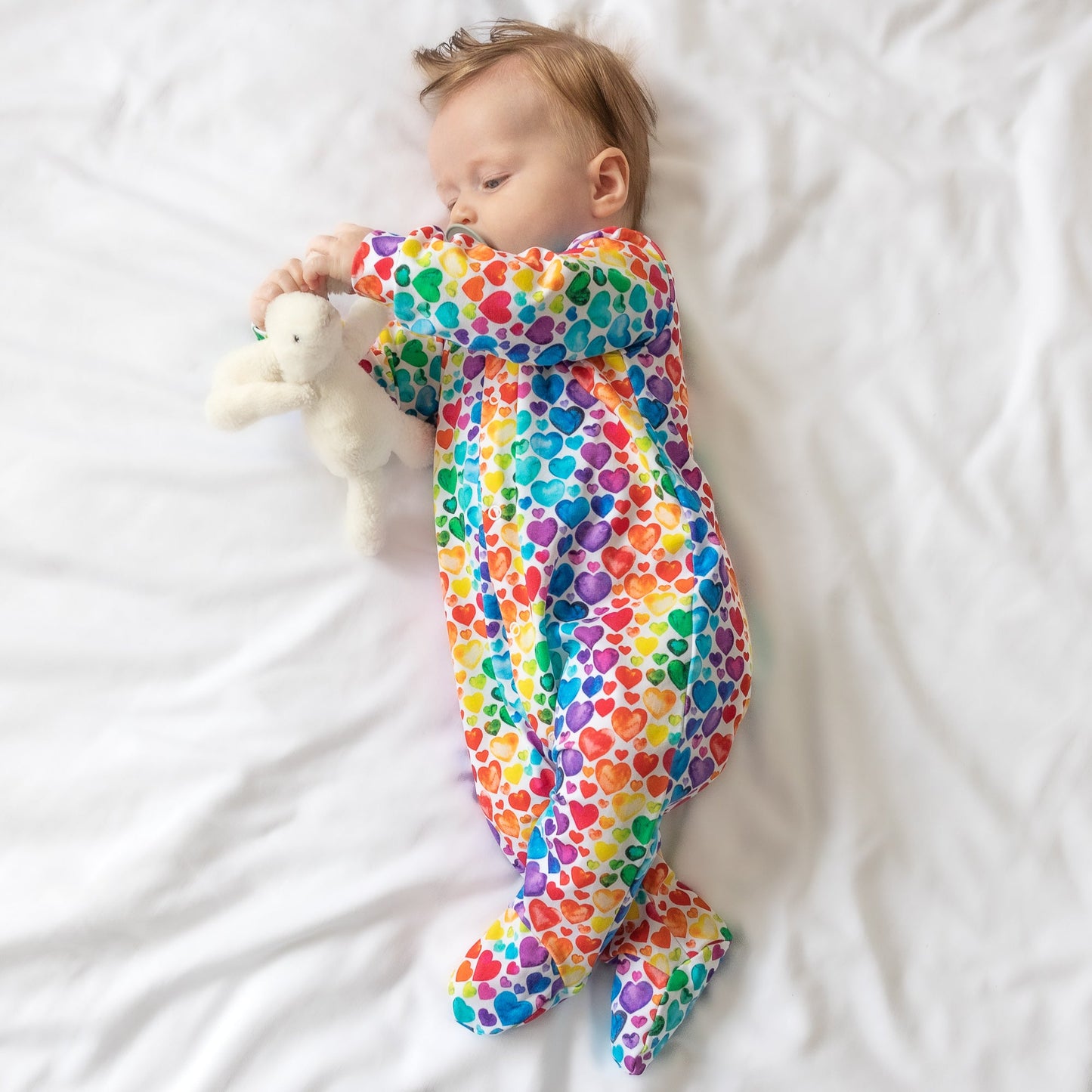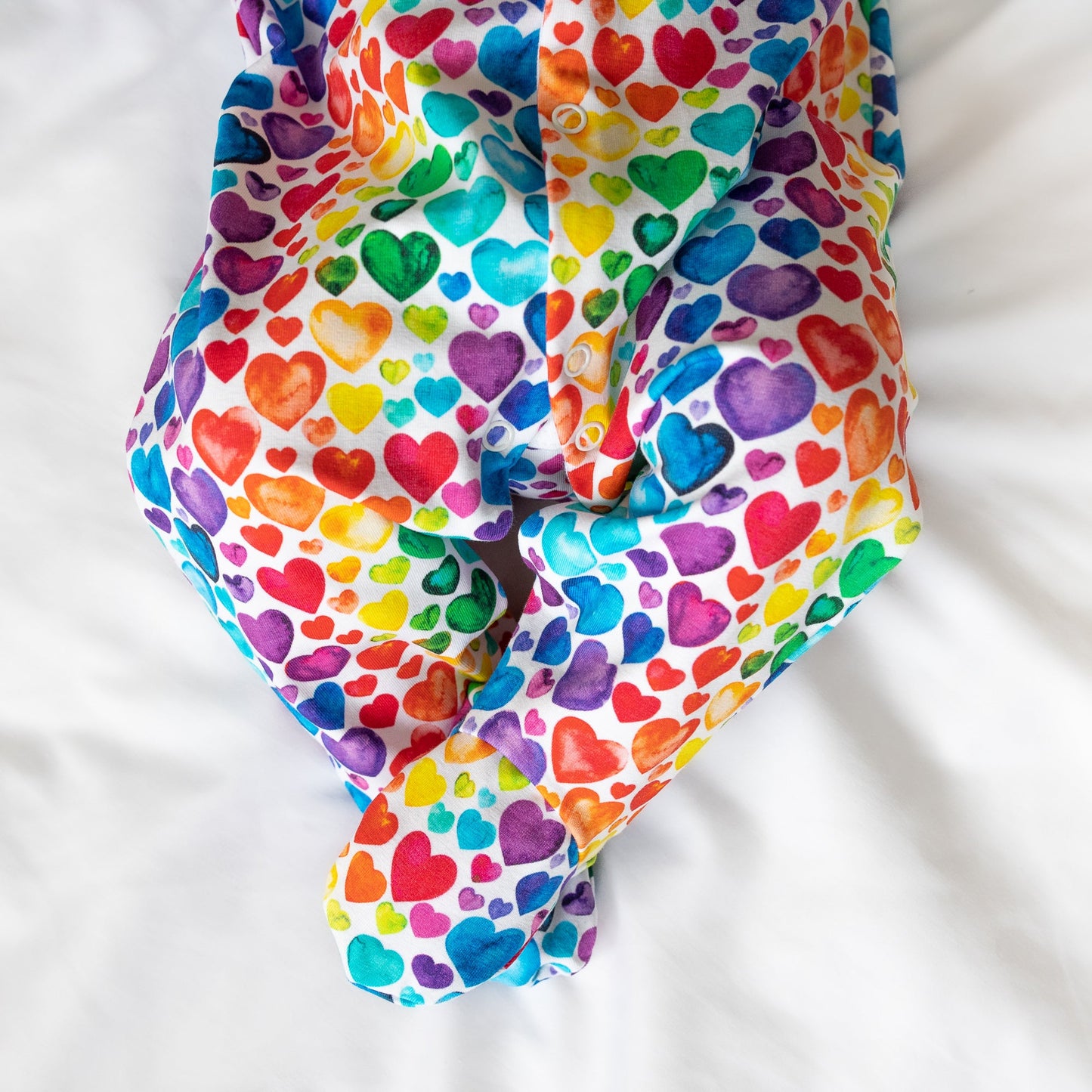 Our new and gorgeous Rainbow heart print sleep suit is the perfect one-piece for any baby.