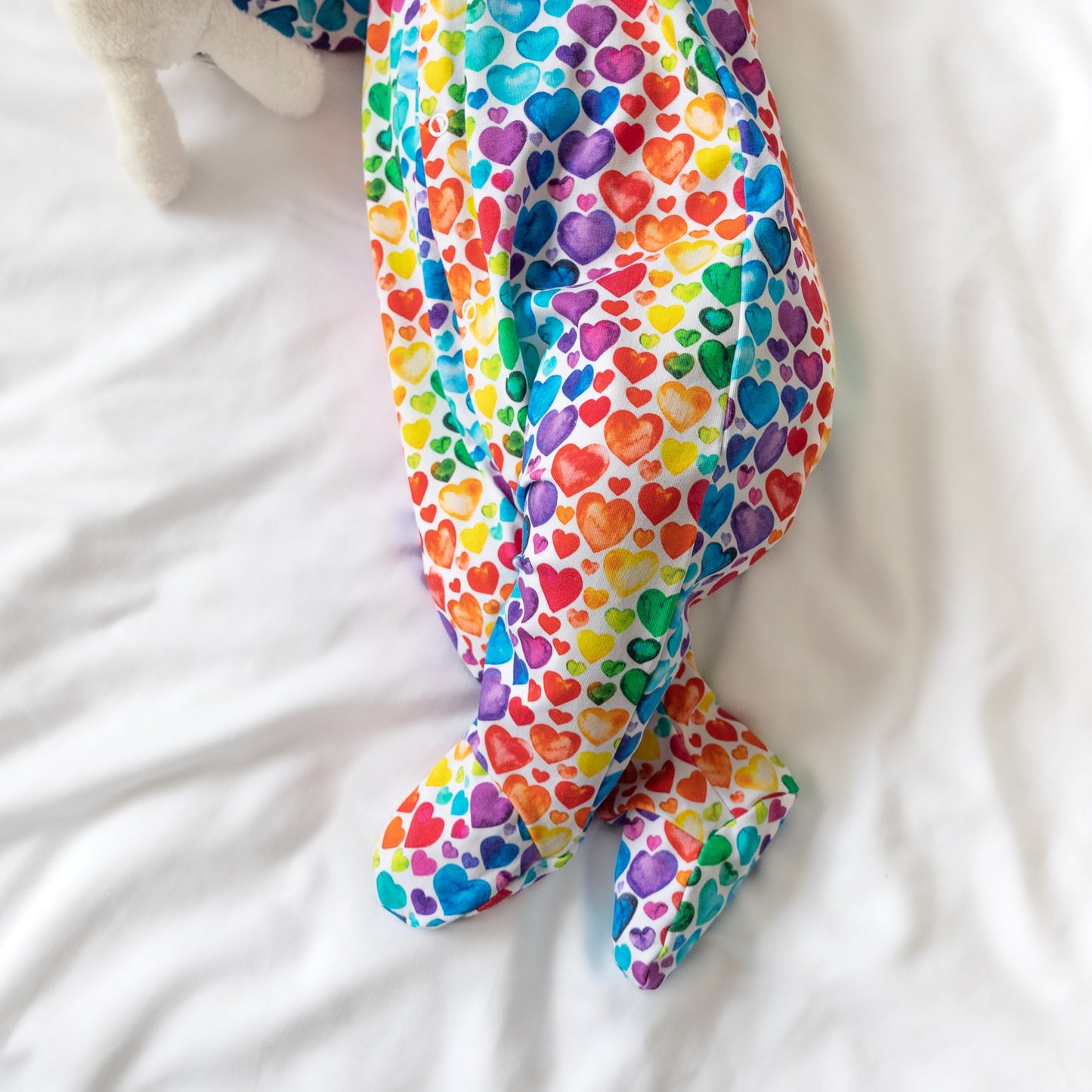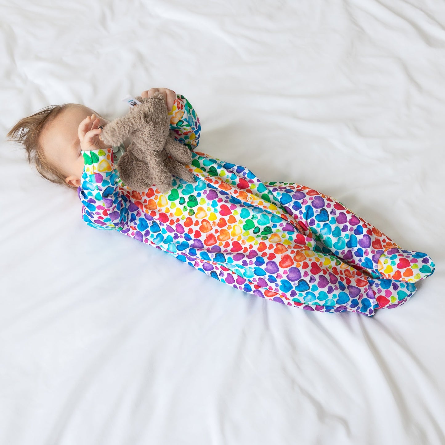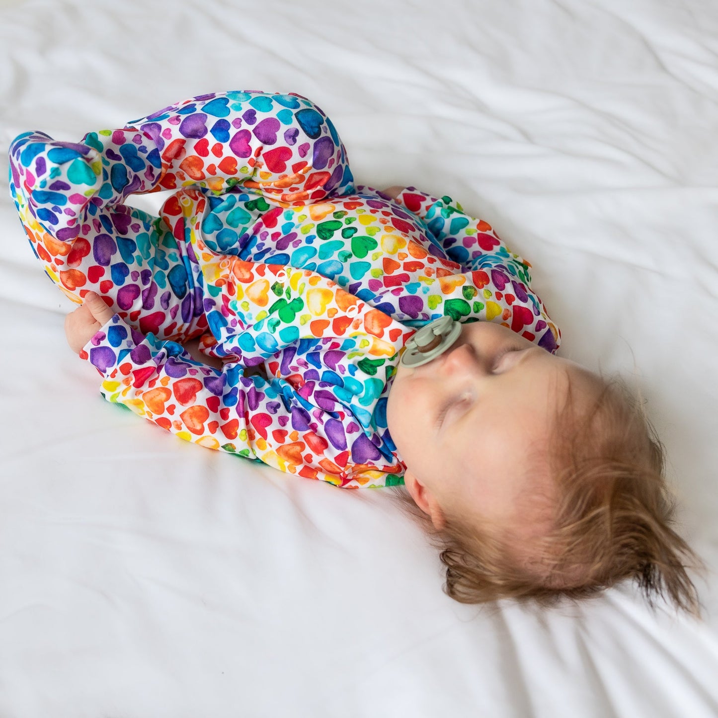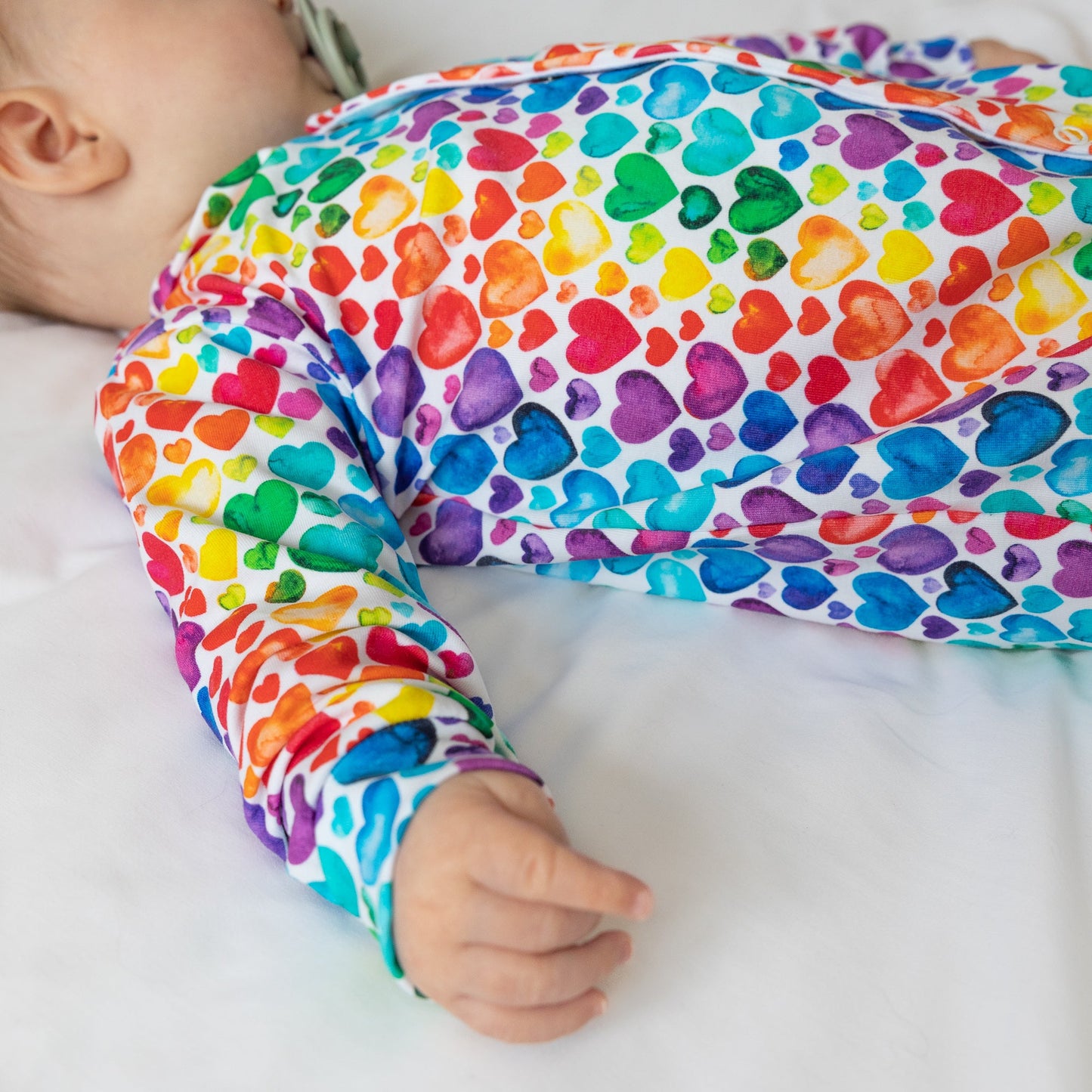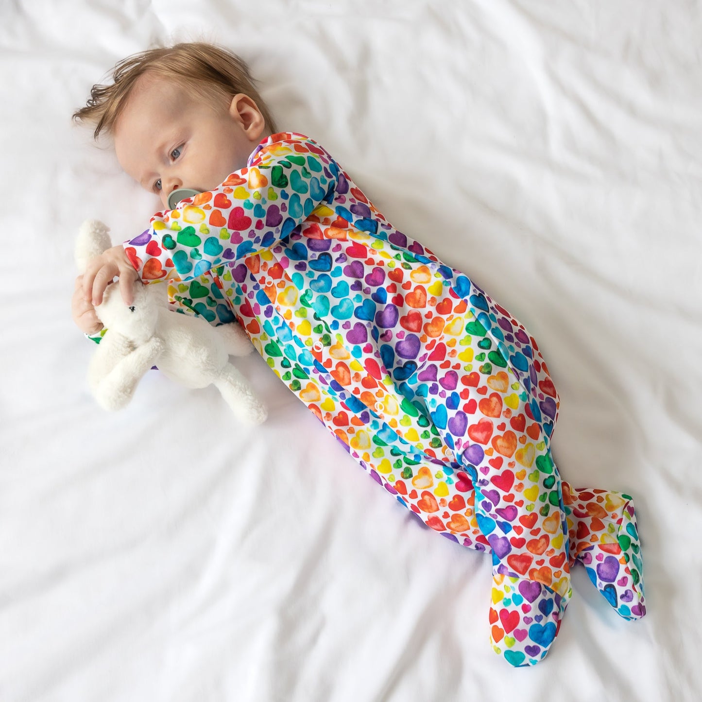 Our new and gorgeous Rainbow heart print sleep suit is the perfect one-piece for any baby.