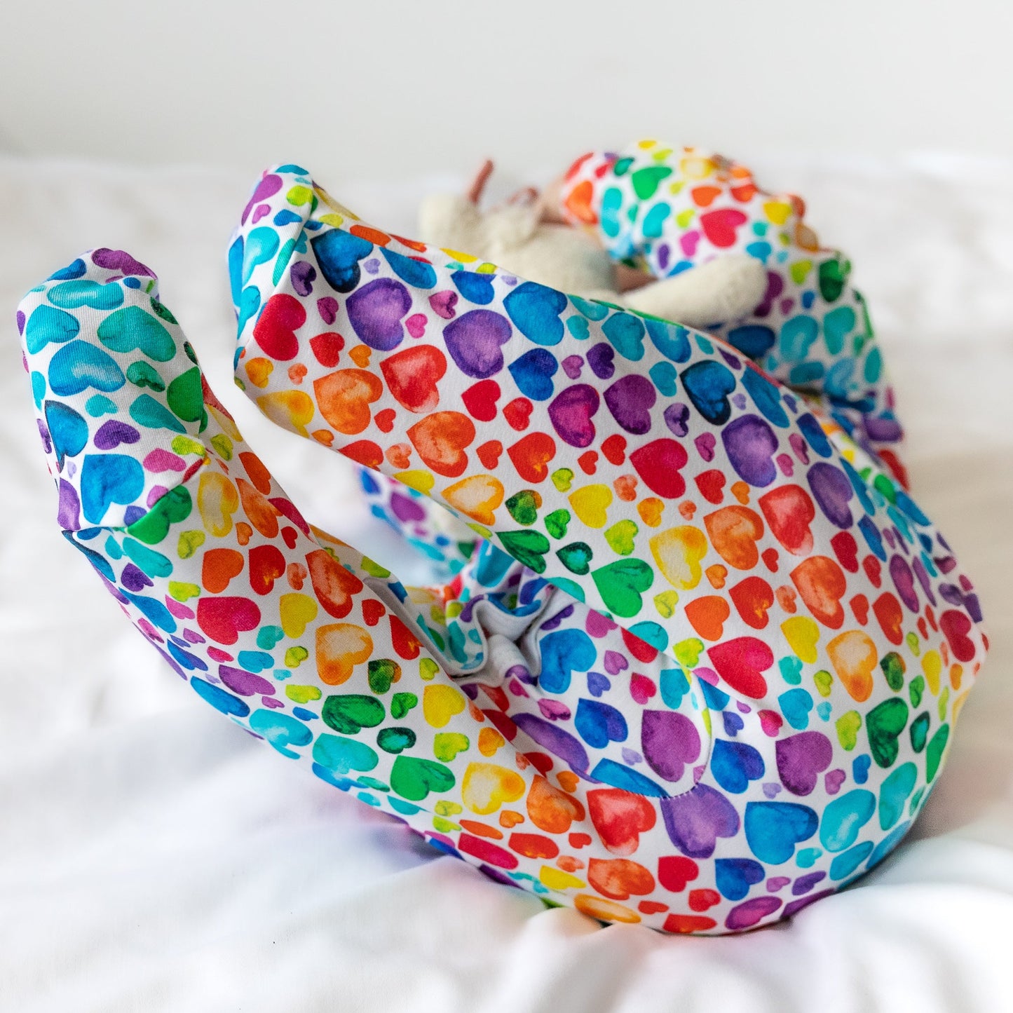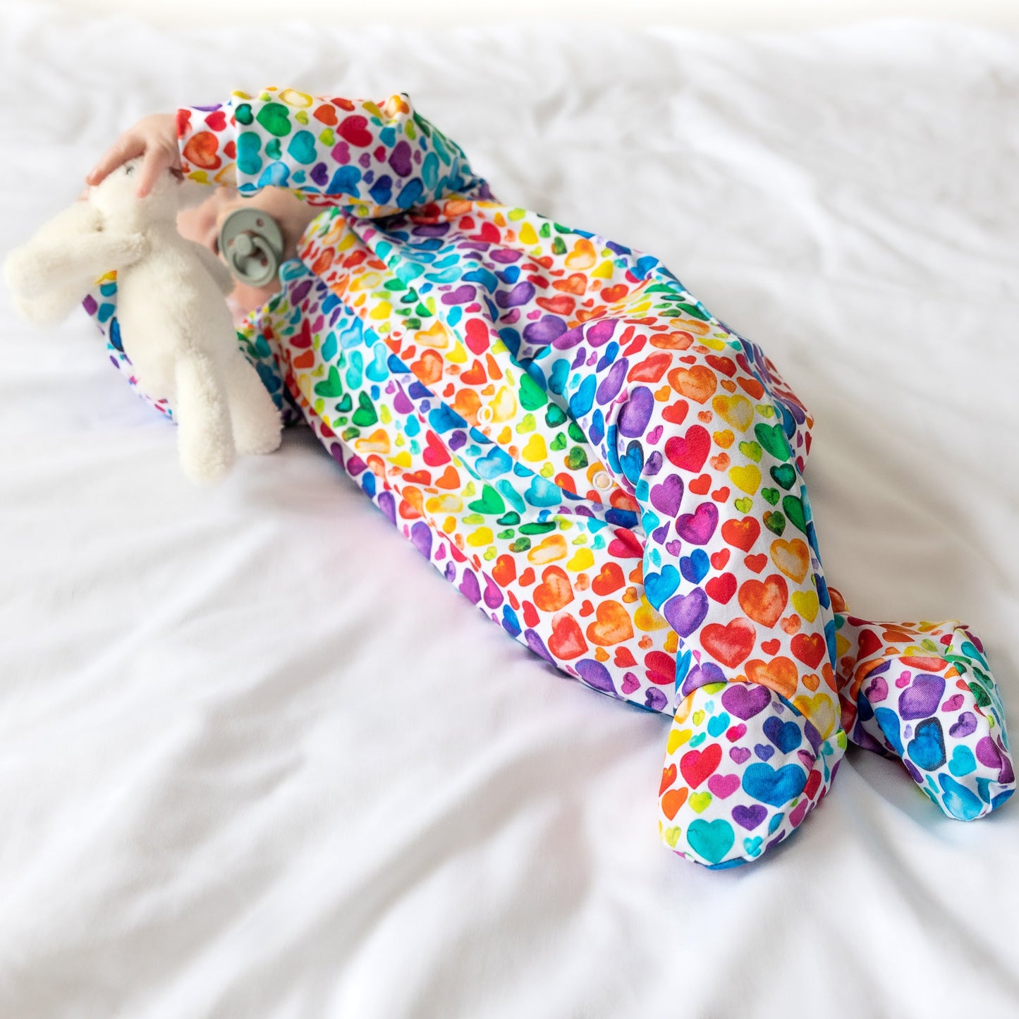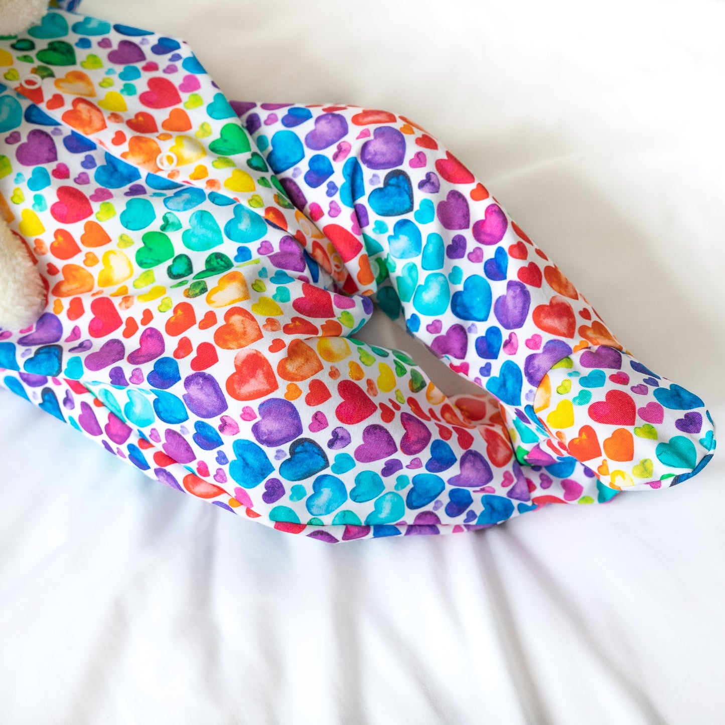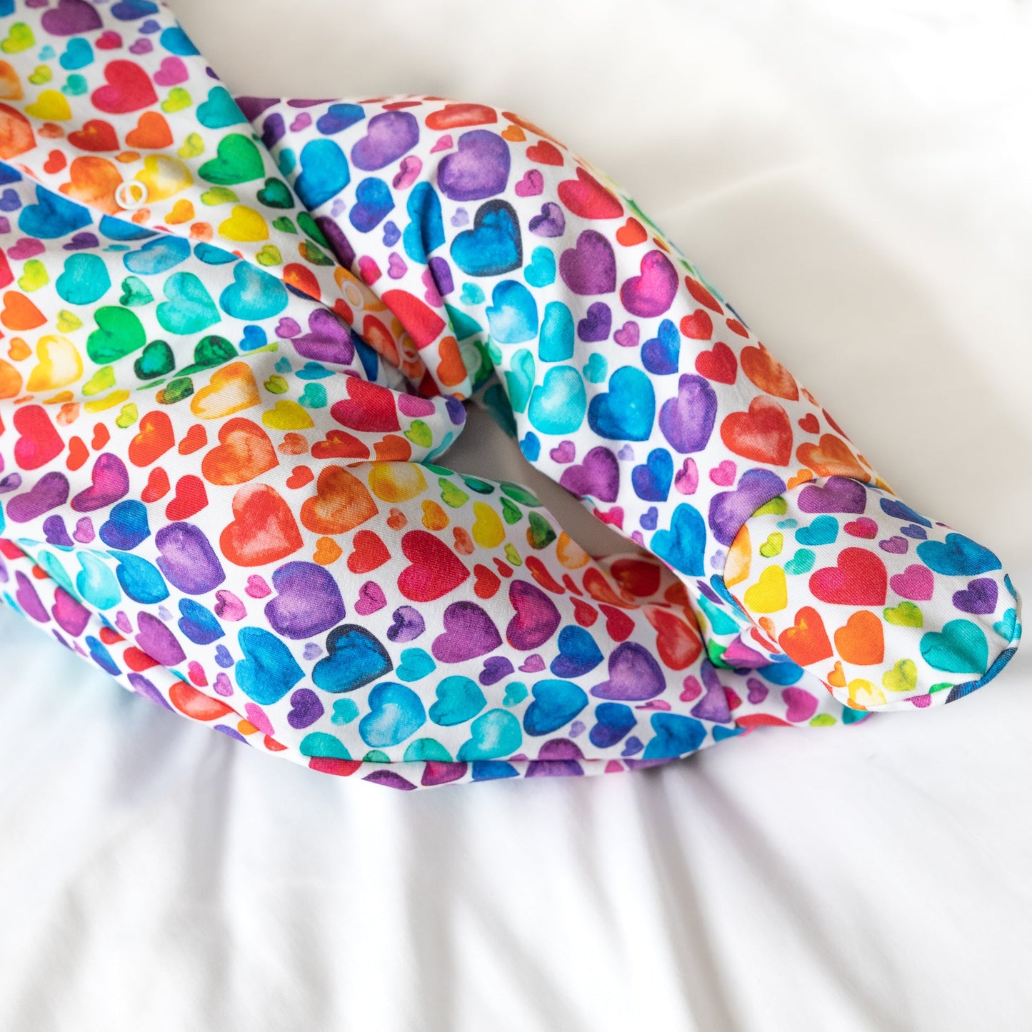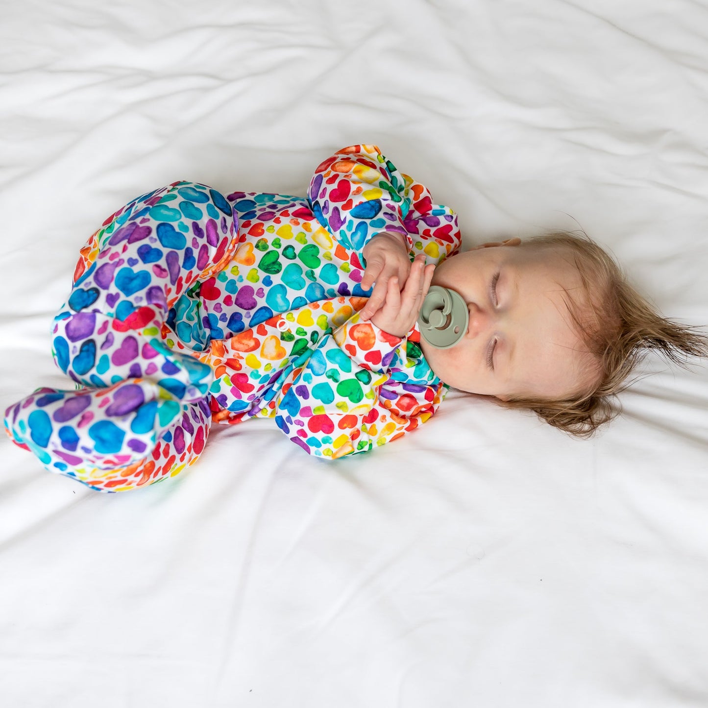 Our new and gorgeous Rainbow heart print sleep suit is the perfect one-piece for any baby.