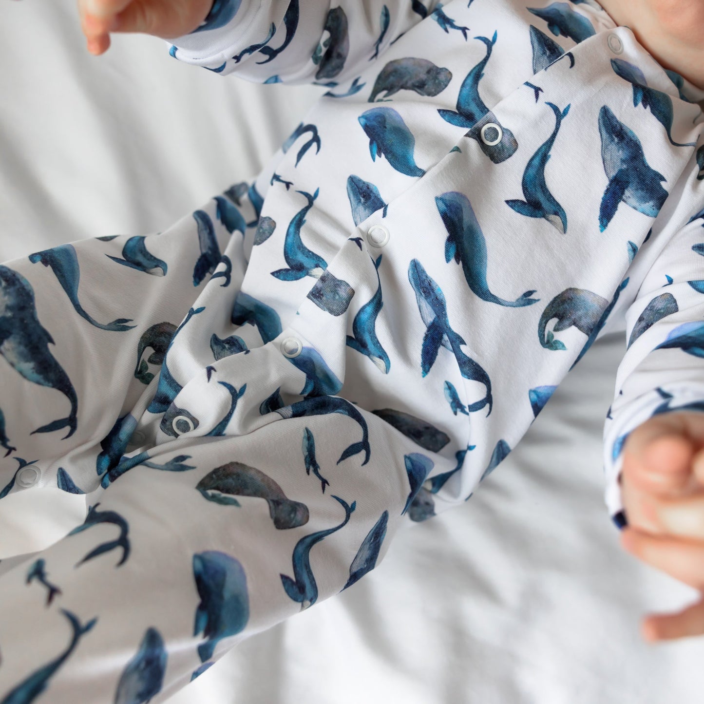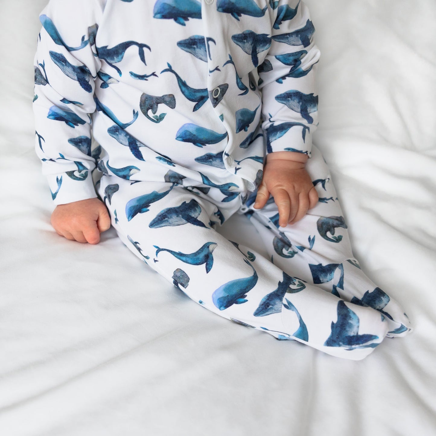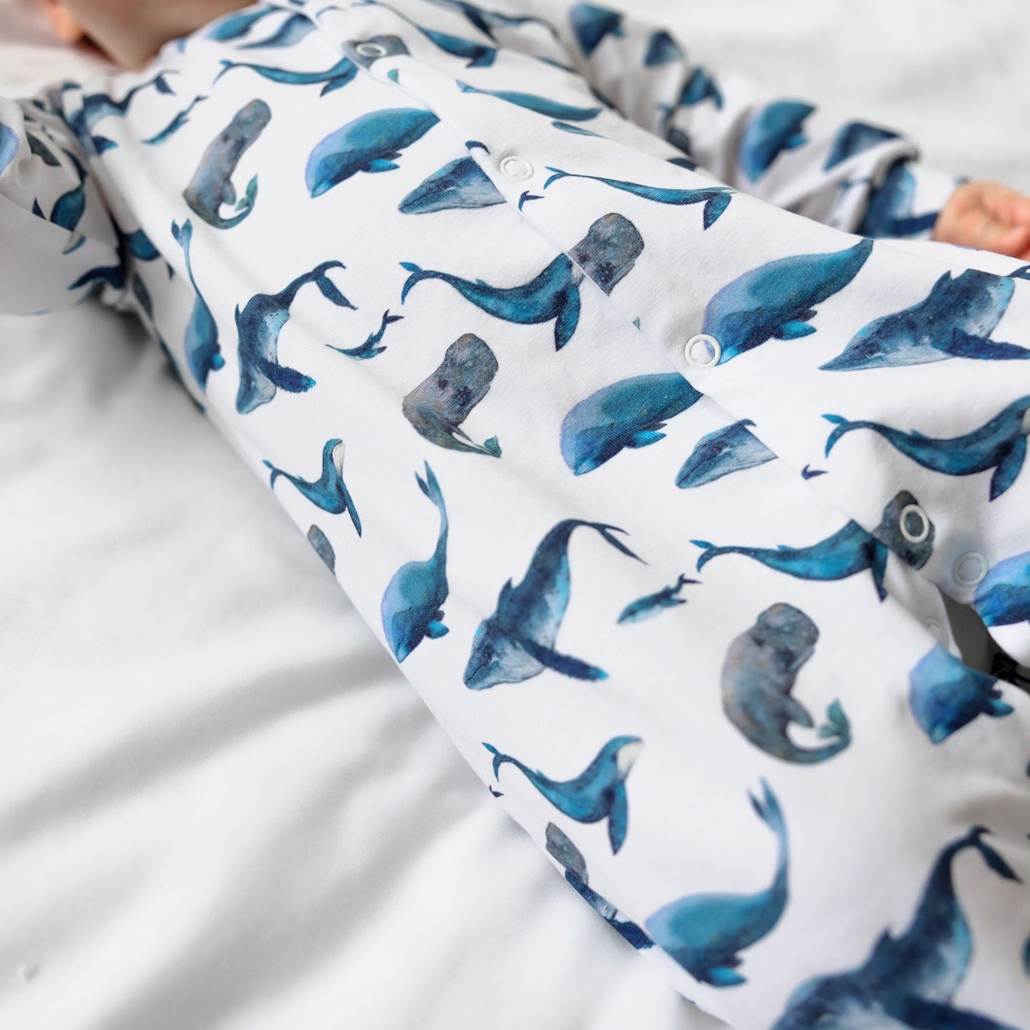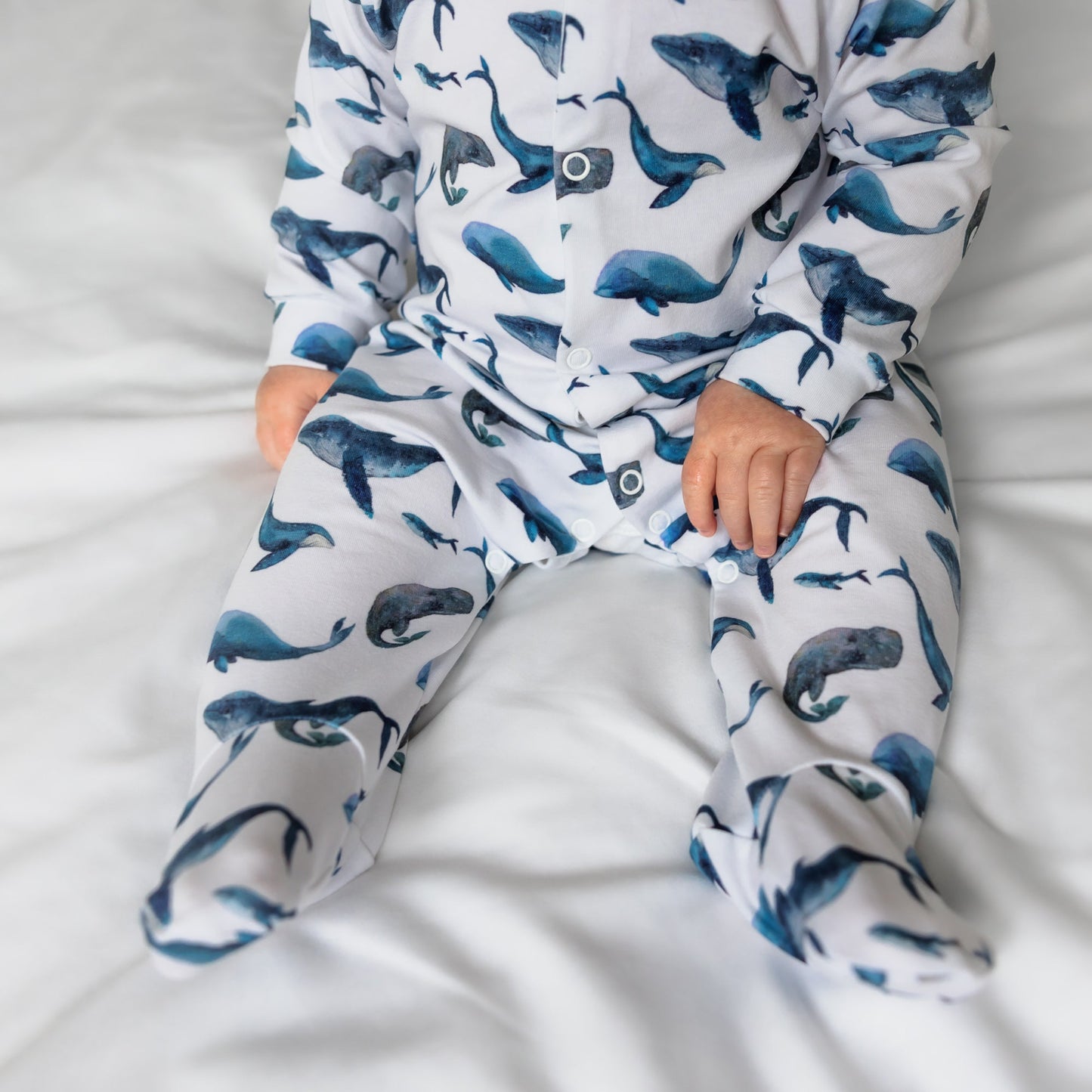 Our new and gorgeous Whale print sleep suit is the perfect one-piece for any baby.