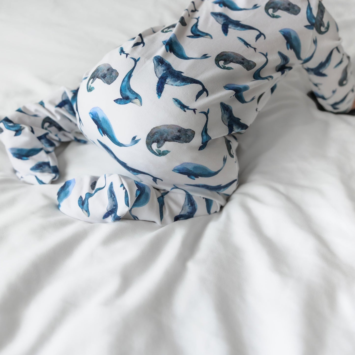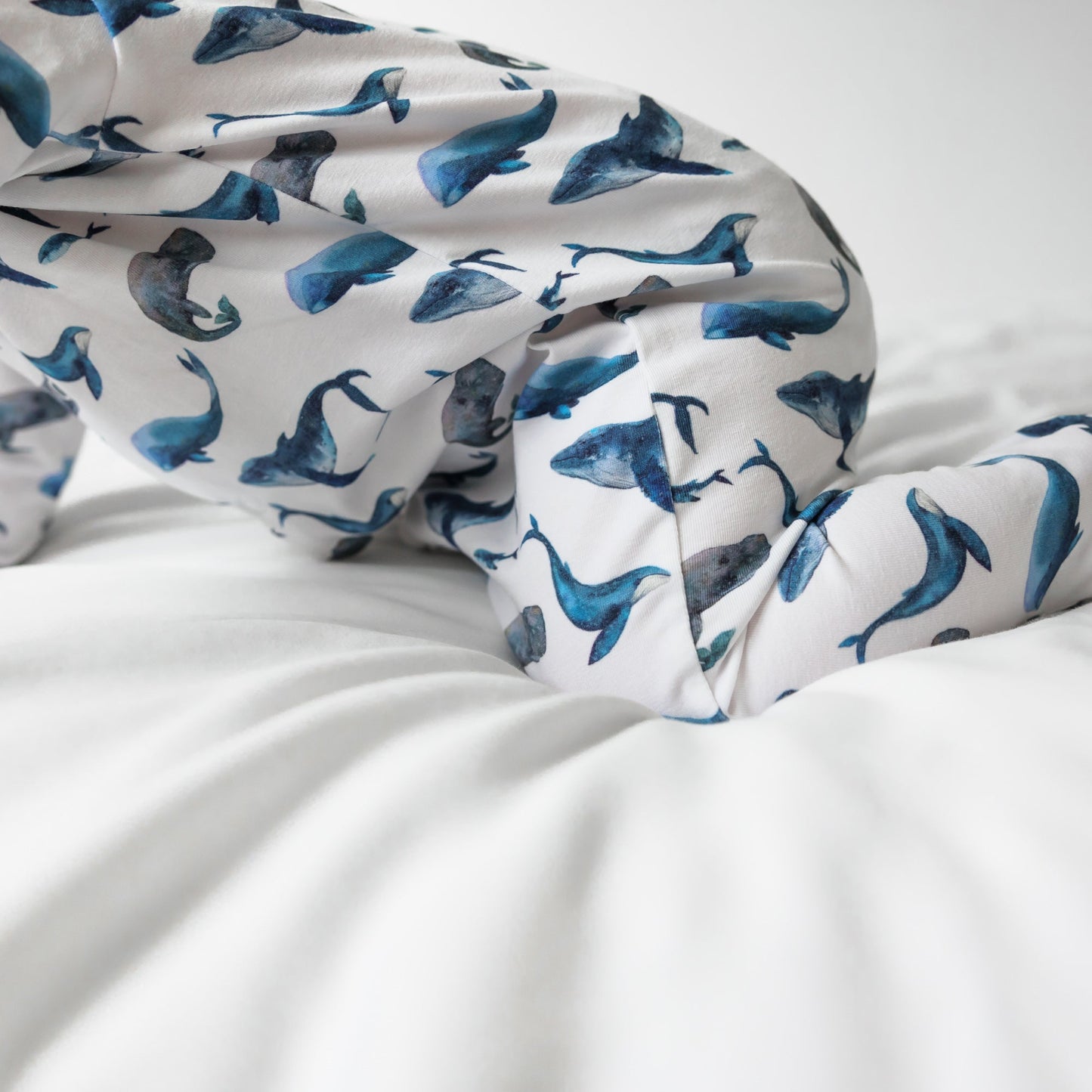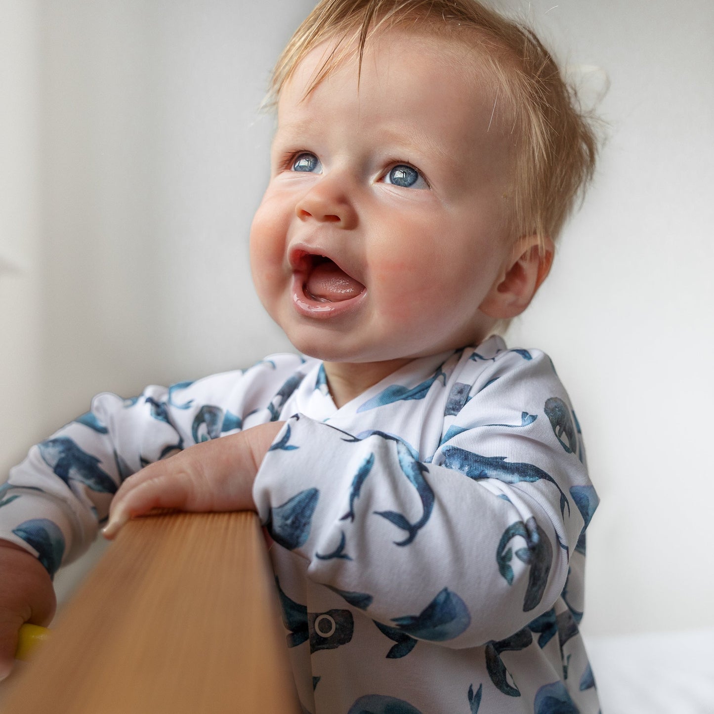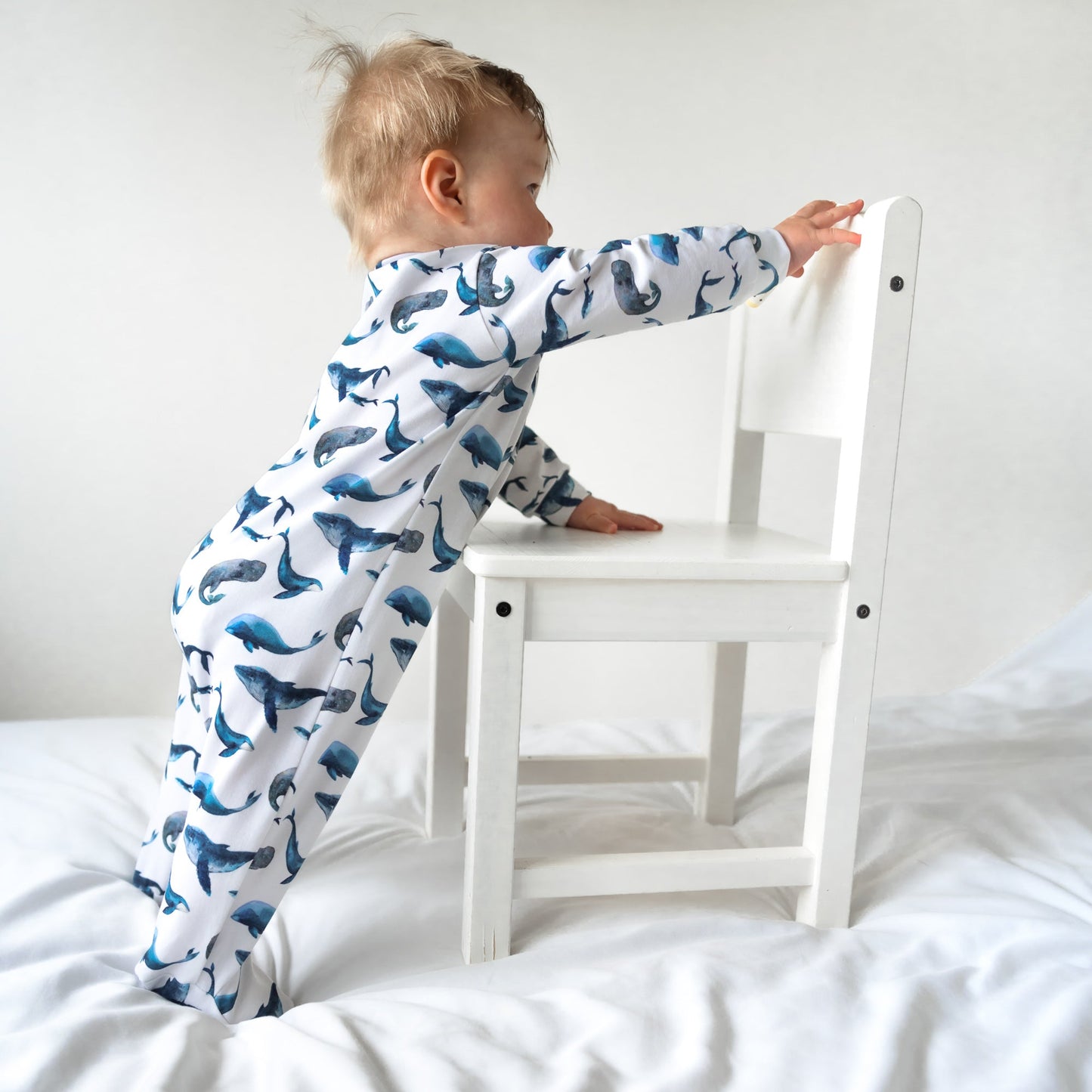 Our new and gorgeous Whale print sleep suit is the perfect one-piece for any baby.