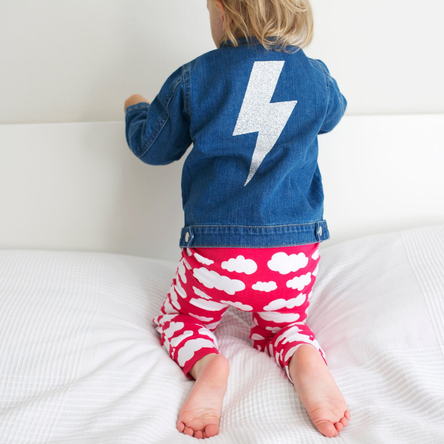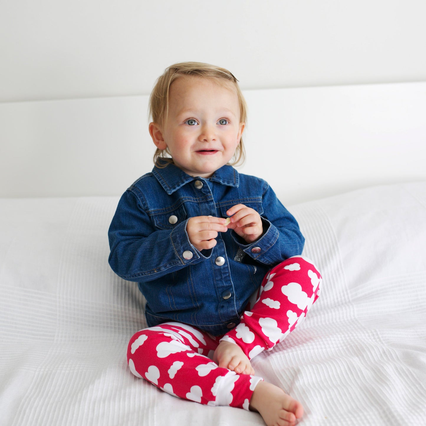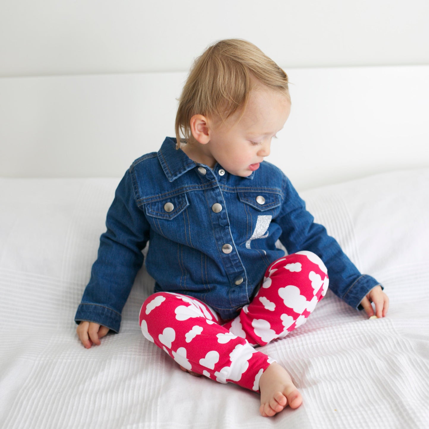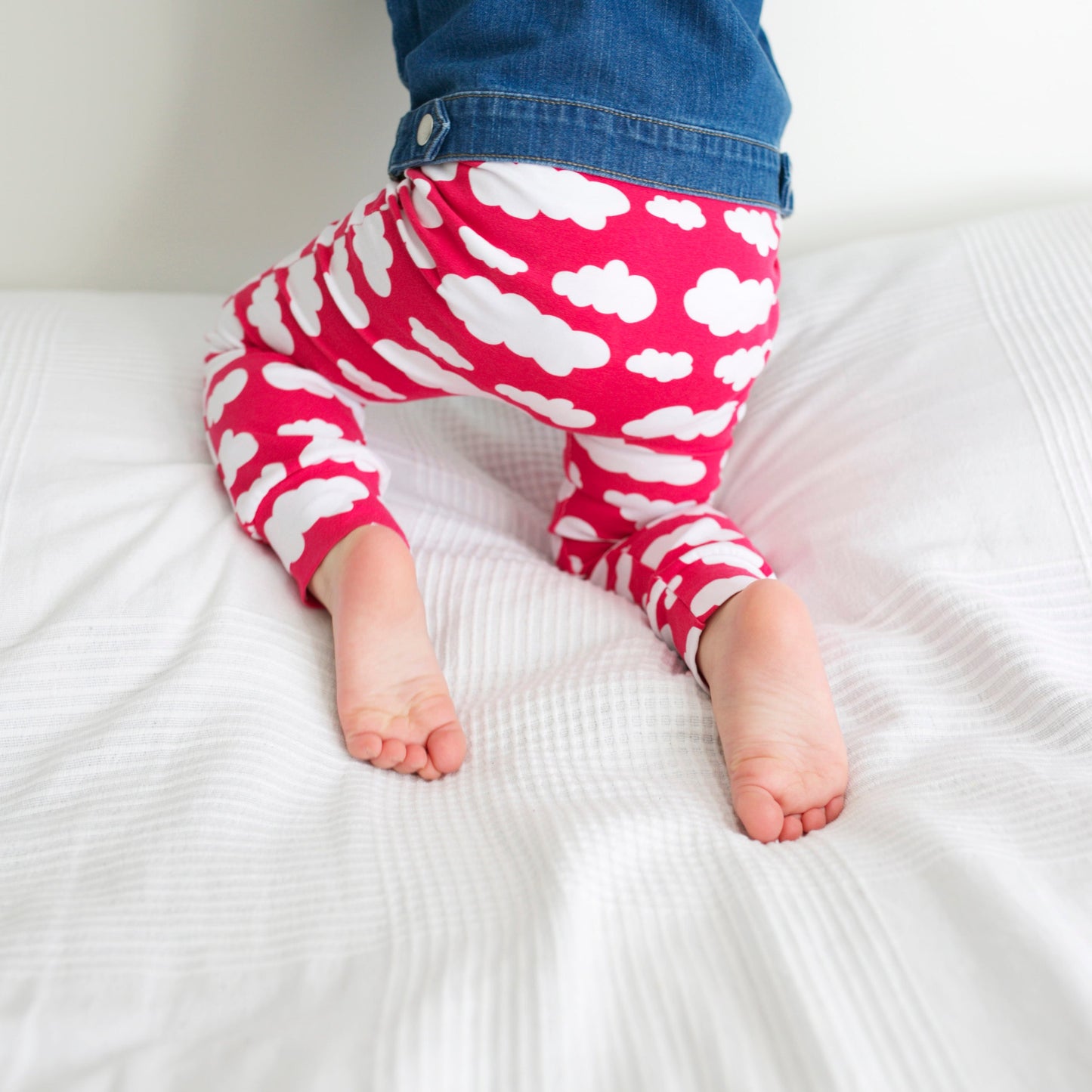 Our most popular cloud print baby leggings are made in the UK from 95% Cotton 5 % Elastane Jersey.