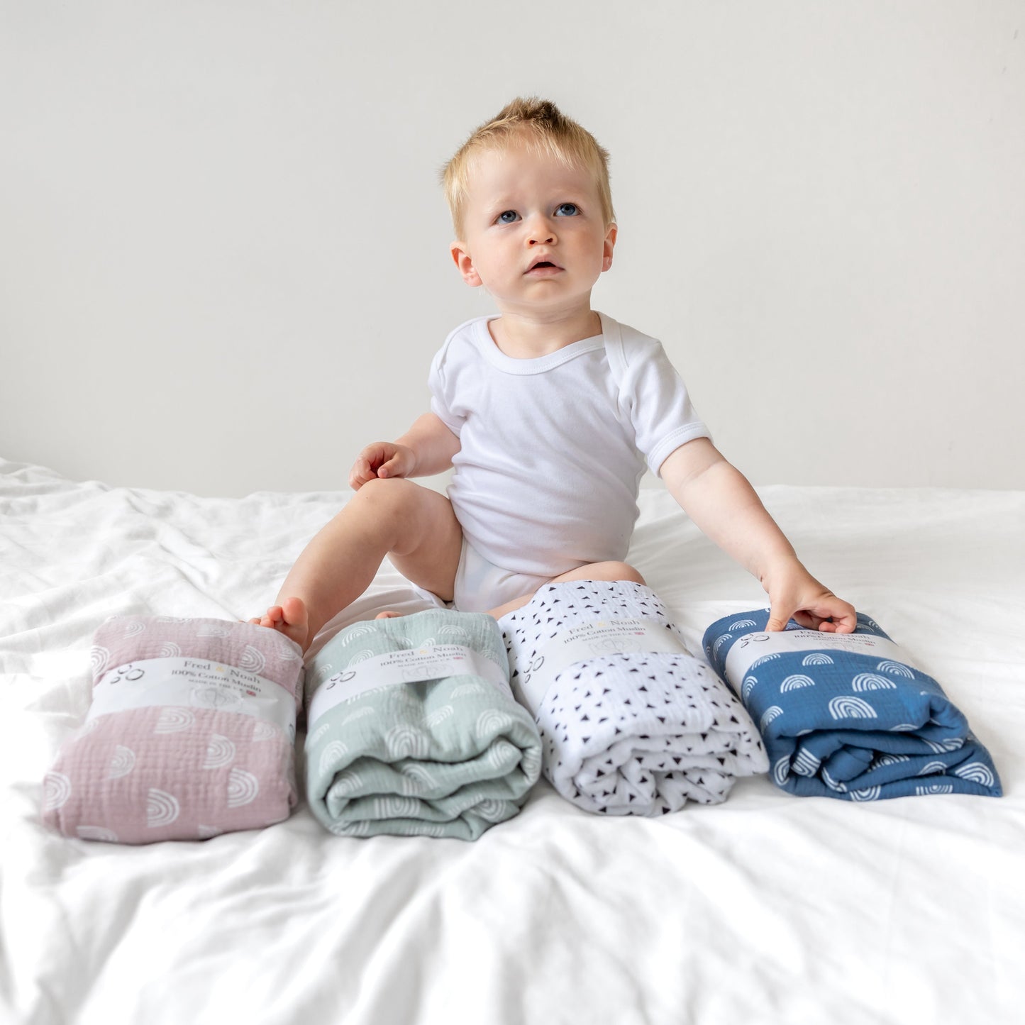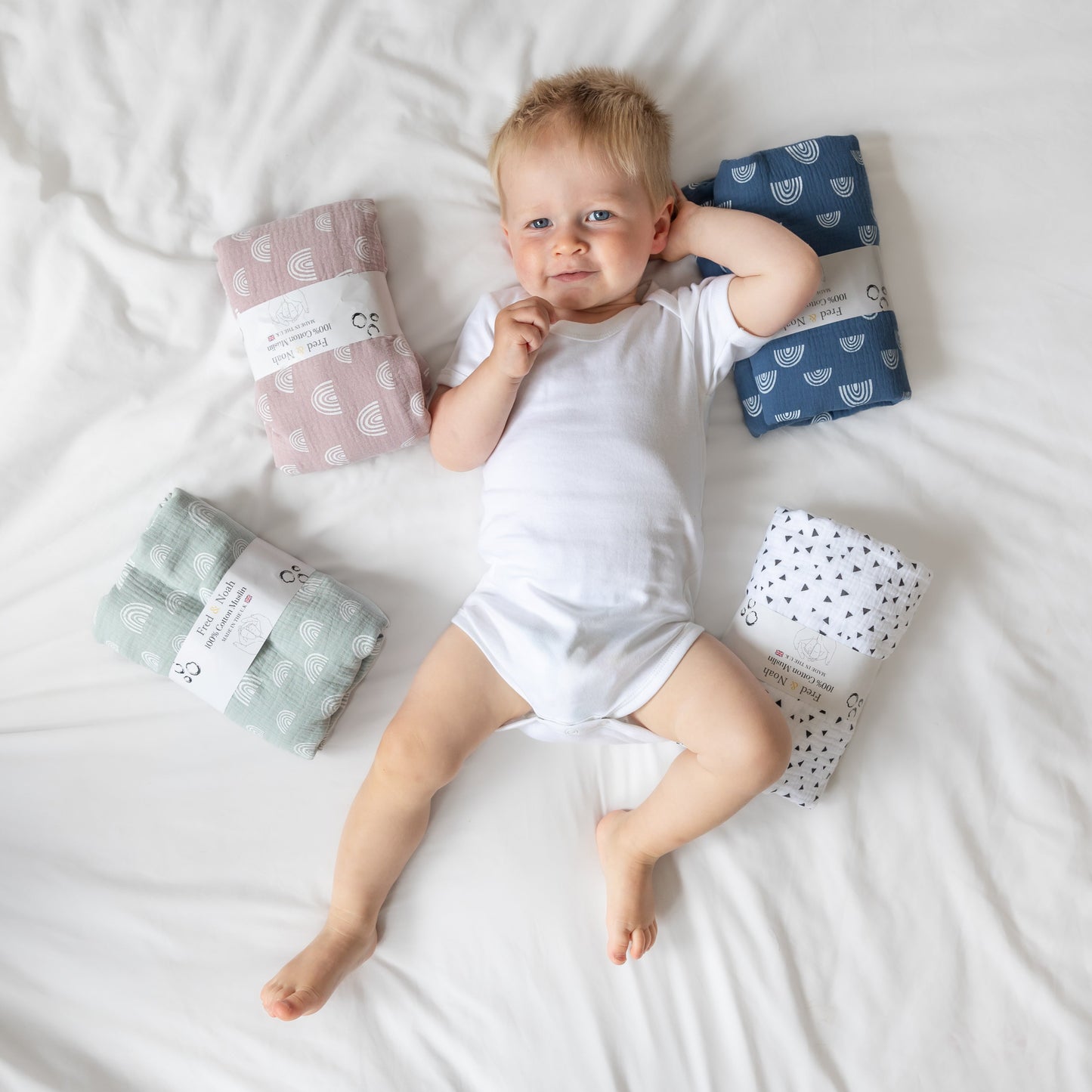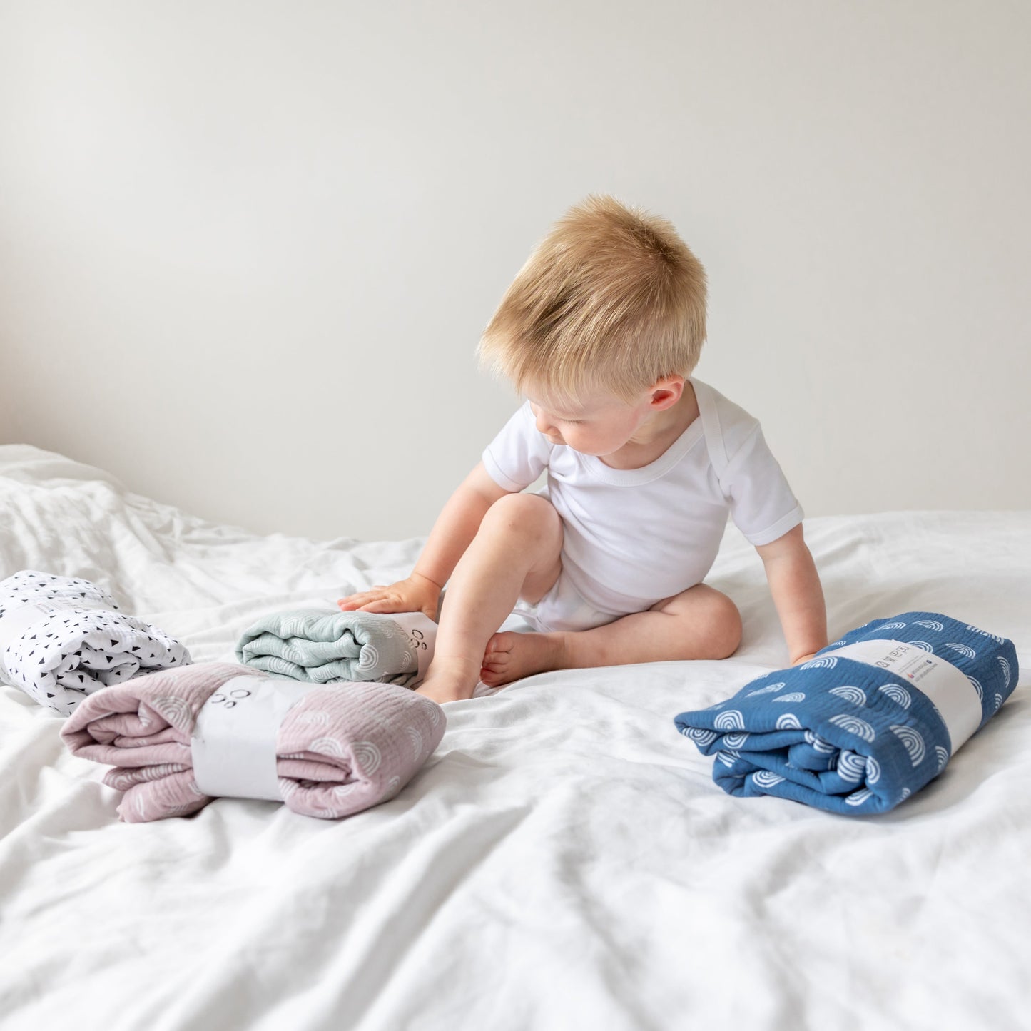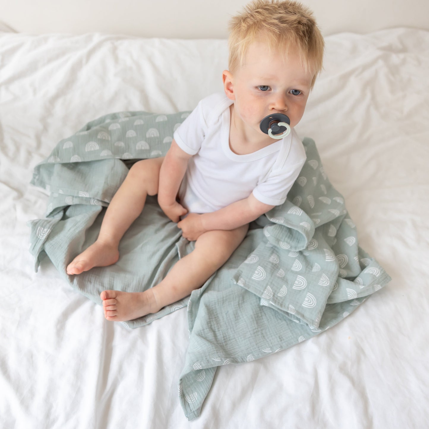 Our XL super soft Organic muslin swaddle is generously sized and perfect for:
