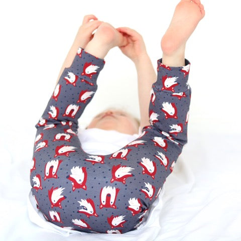 Fred & Noah baby leggings feature an enclosed non roll elasticated waist and are available in sizes 0-6. ( Premature sizes are available upon request ) The leggings also feature a reversible ankle cuff which can be turned up for shorter babies whilst also keeping their little socks on .All of our styles are cut for both disposable and cloth nappies and can be mixed and matched with our range of hand printed vests and T shirts .