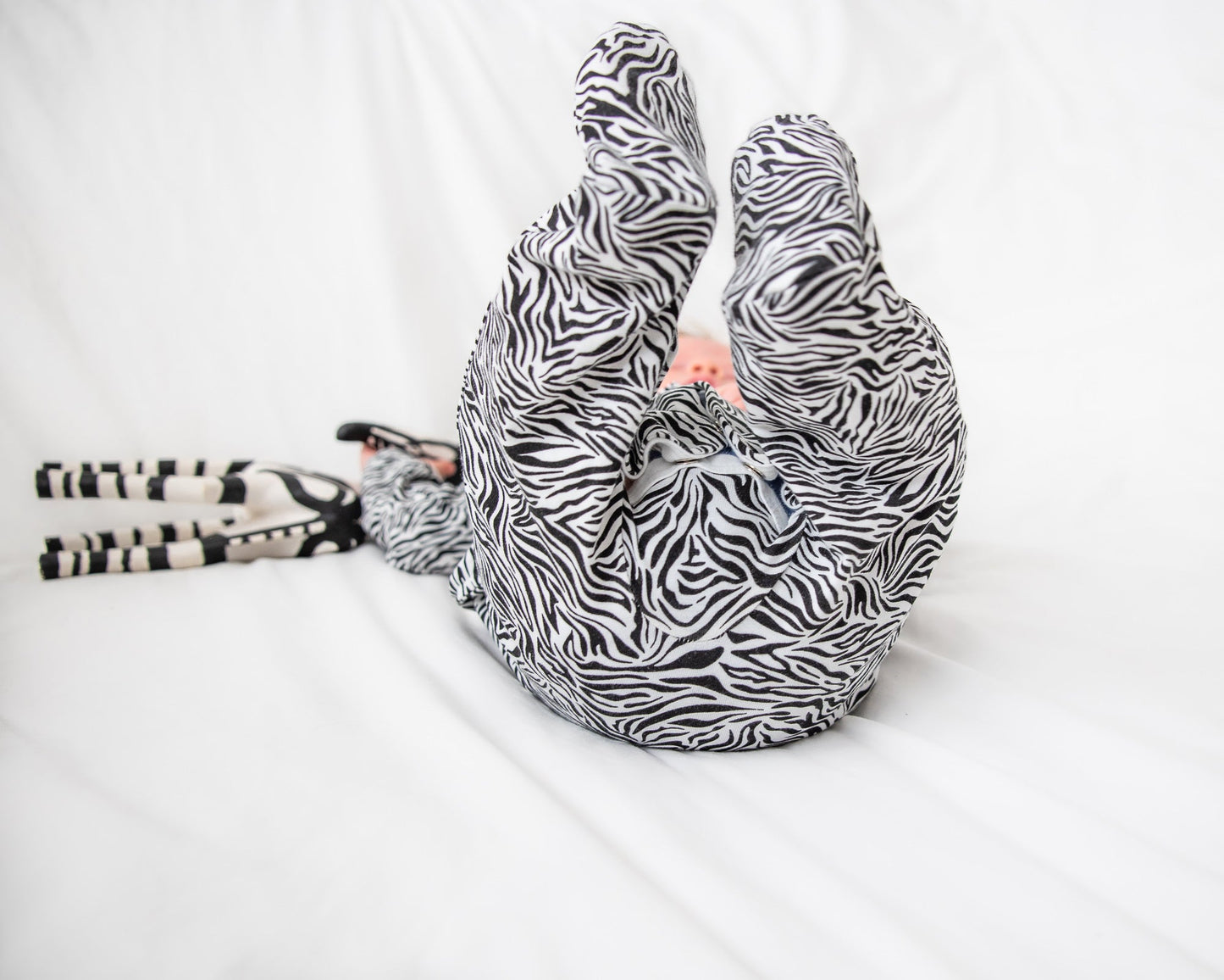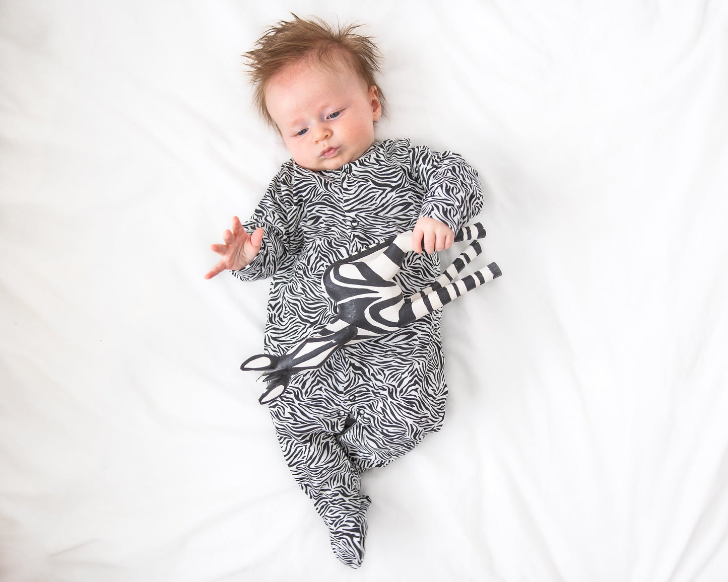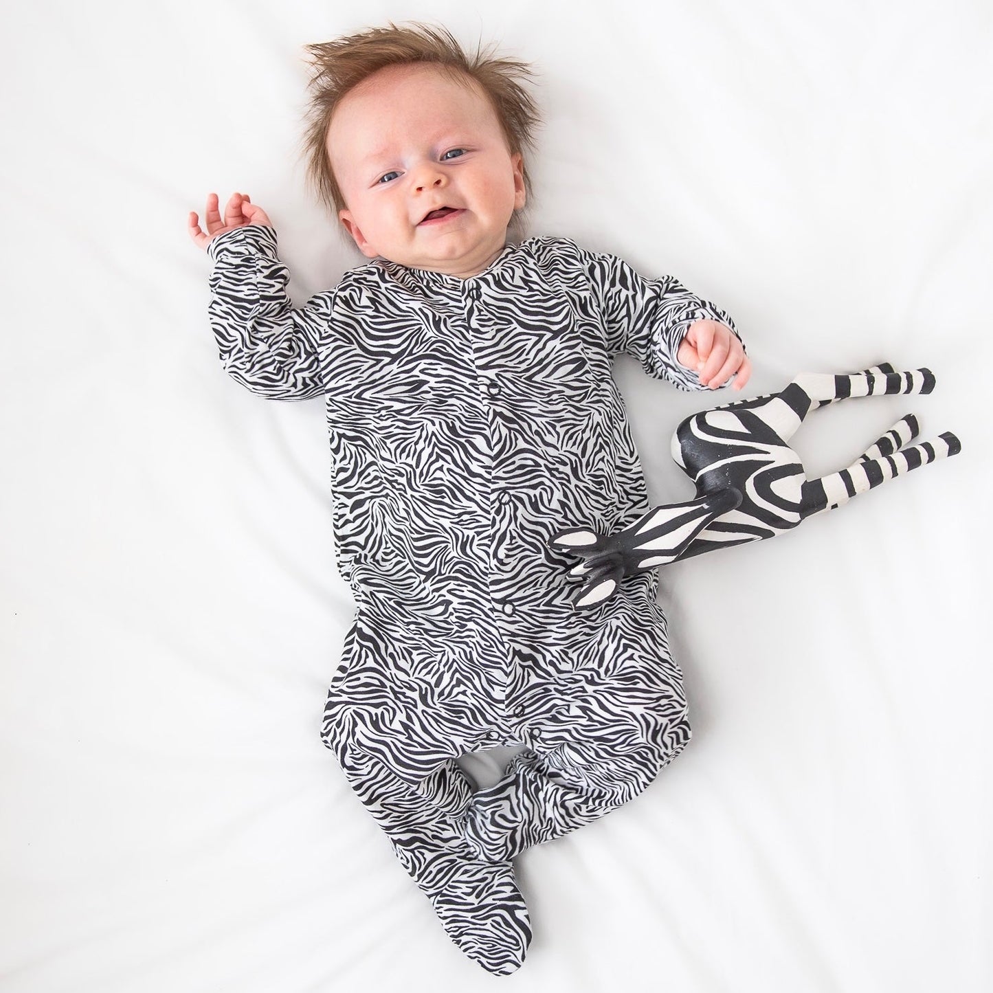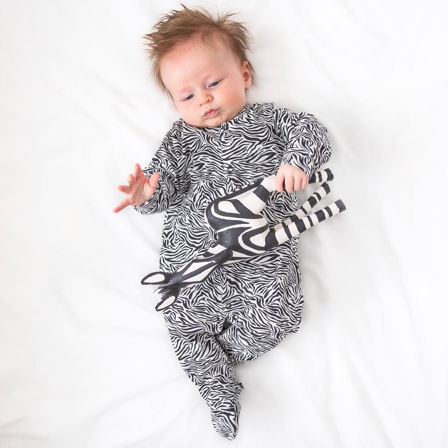 Our new and gorgeous Zebra print sleep suit is the perfect one-piece for any baby.