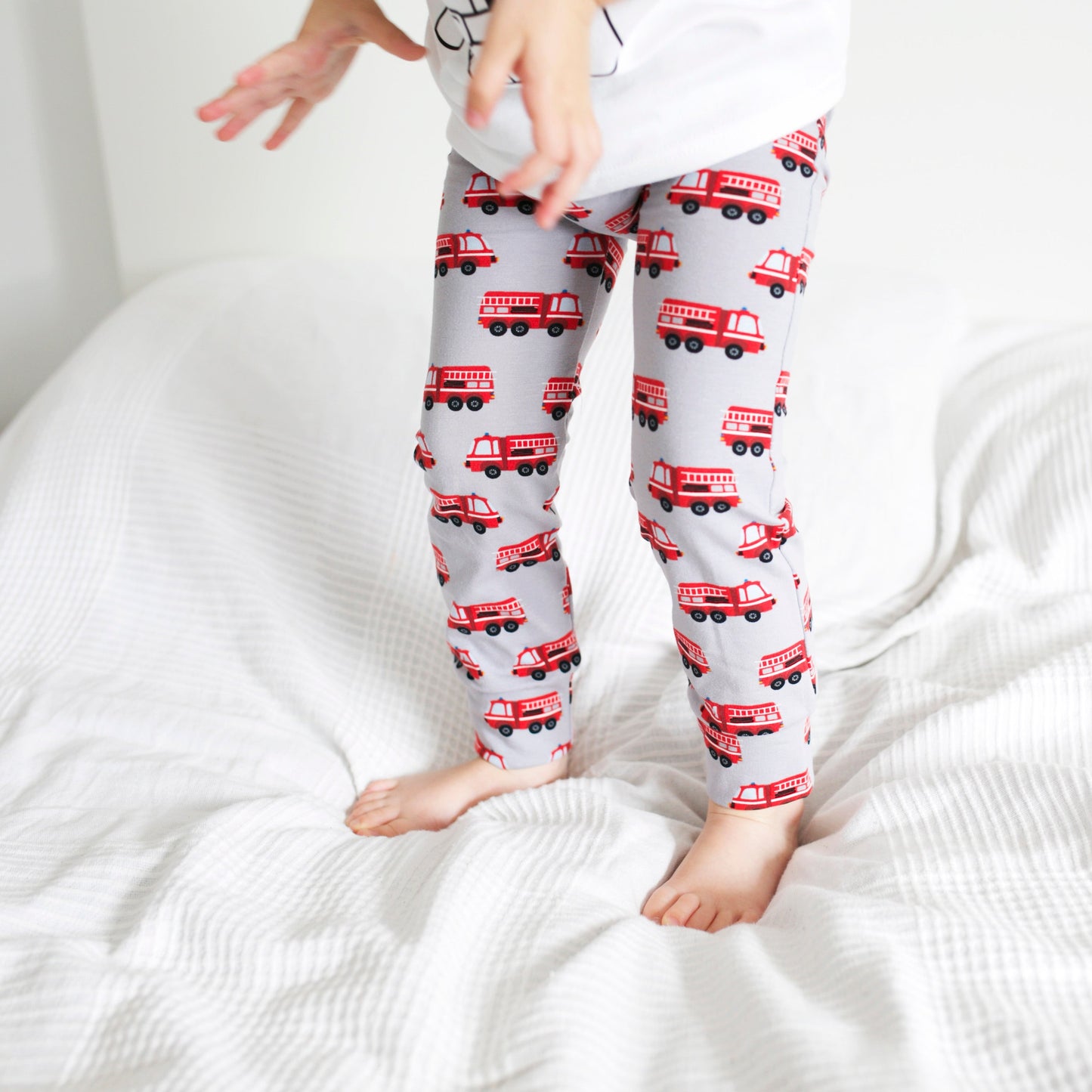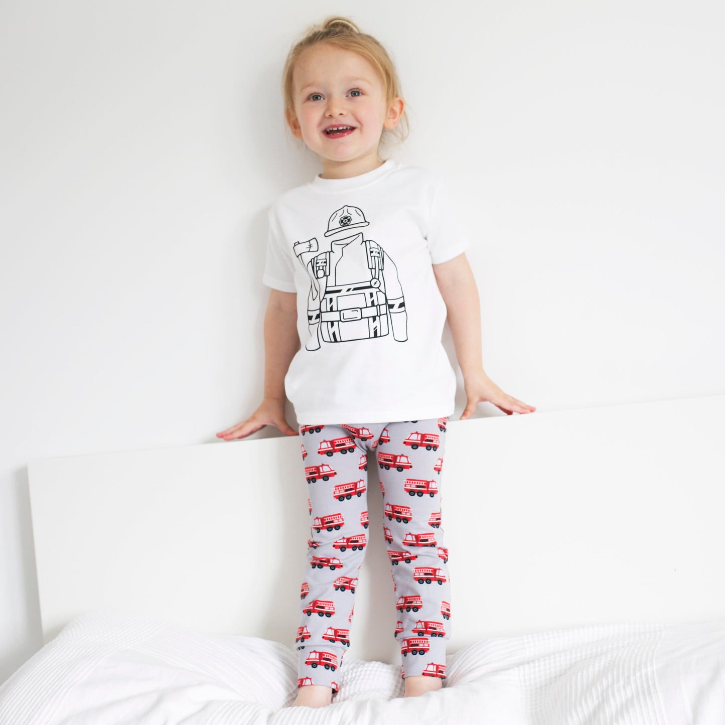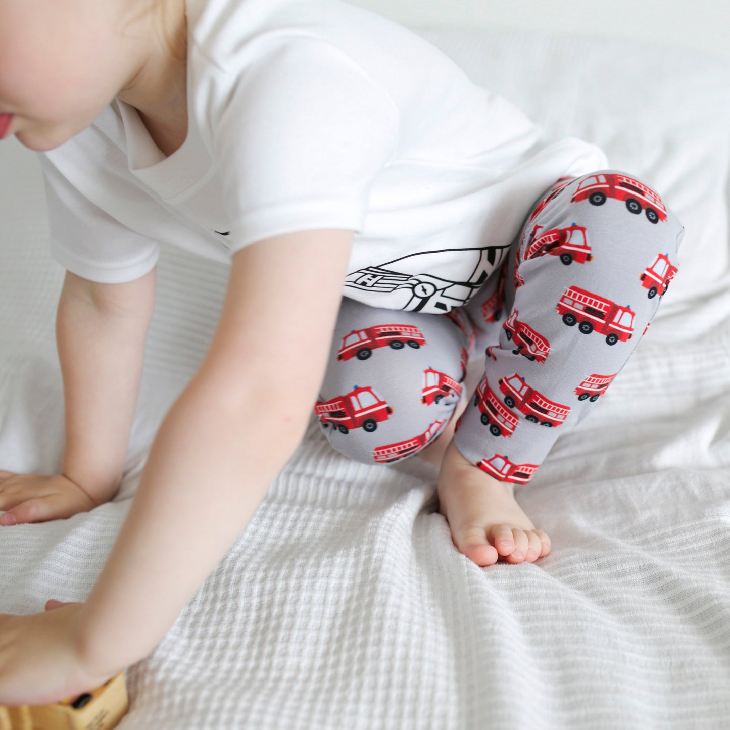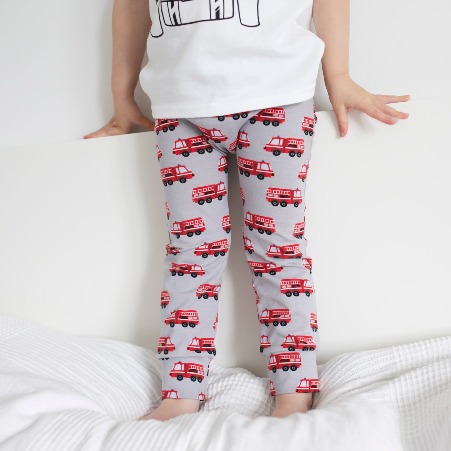 Our Grey fire engine print baby leggings are made in the UK from 95% Cotton 5 % Elastane Jersey.