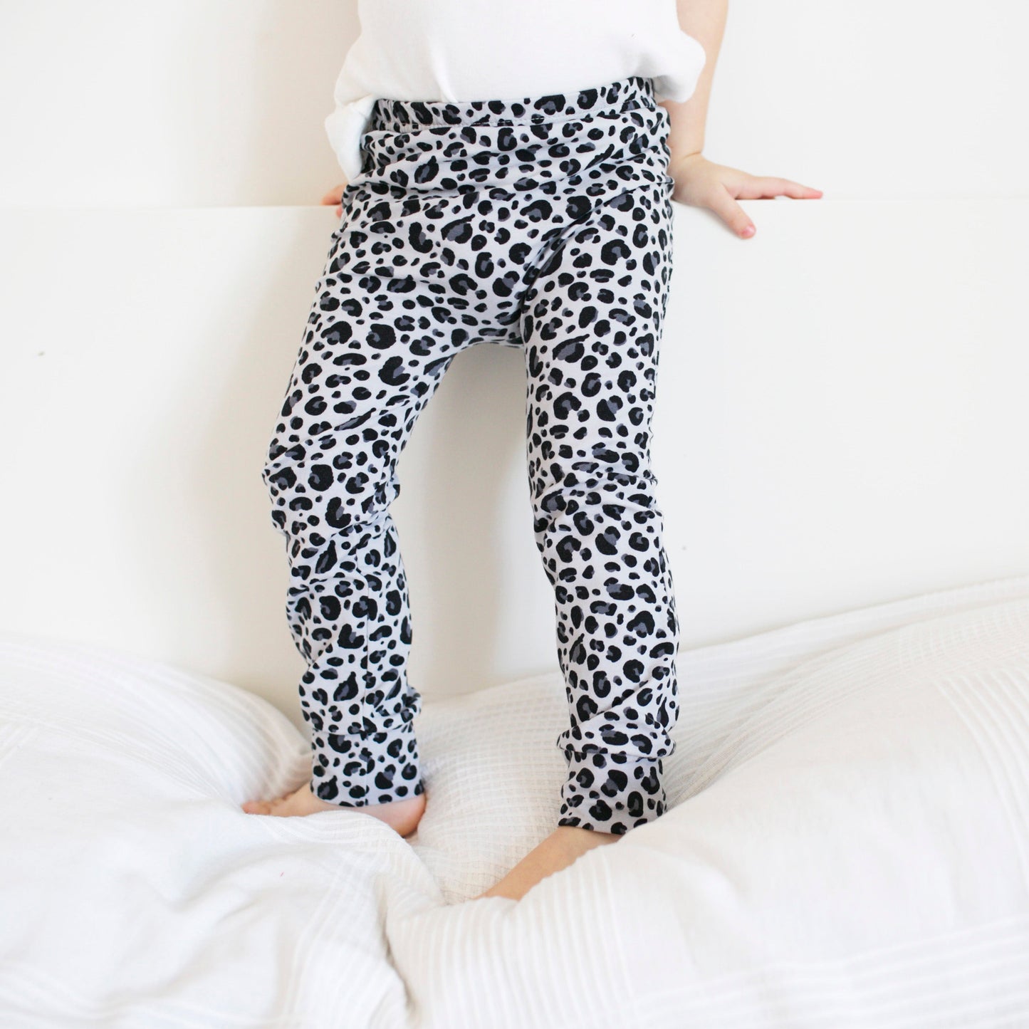 Fred & Noah baby leggings feature an enclosed non roll elasticated waist and are available in sizes 0-6. The leggings also feature a reversible ankle cuff which can be turned up for shorter babies whilst also keeping their little socks on .All of our styles are cut for both disposable and cloth nappies and can be mixed and matched with our range of hand printed vests and T shirts .
