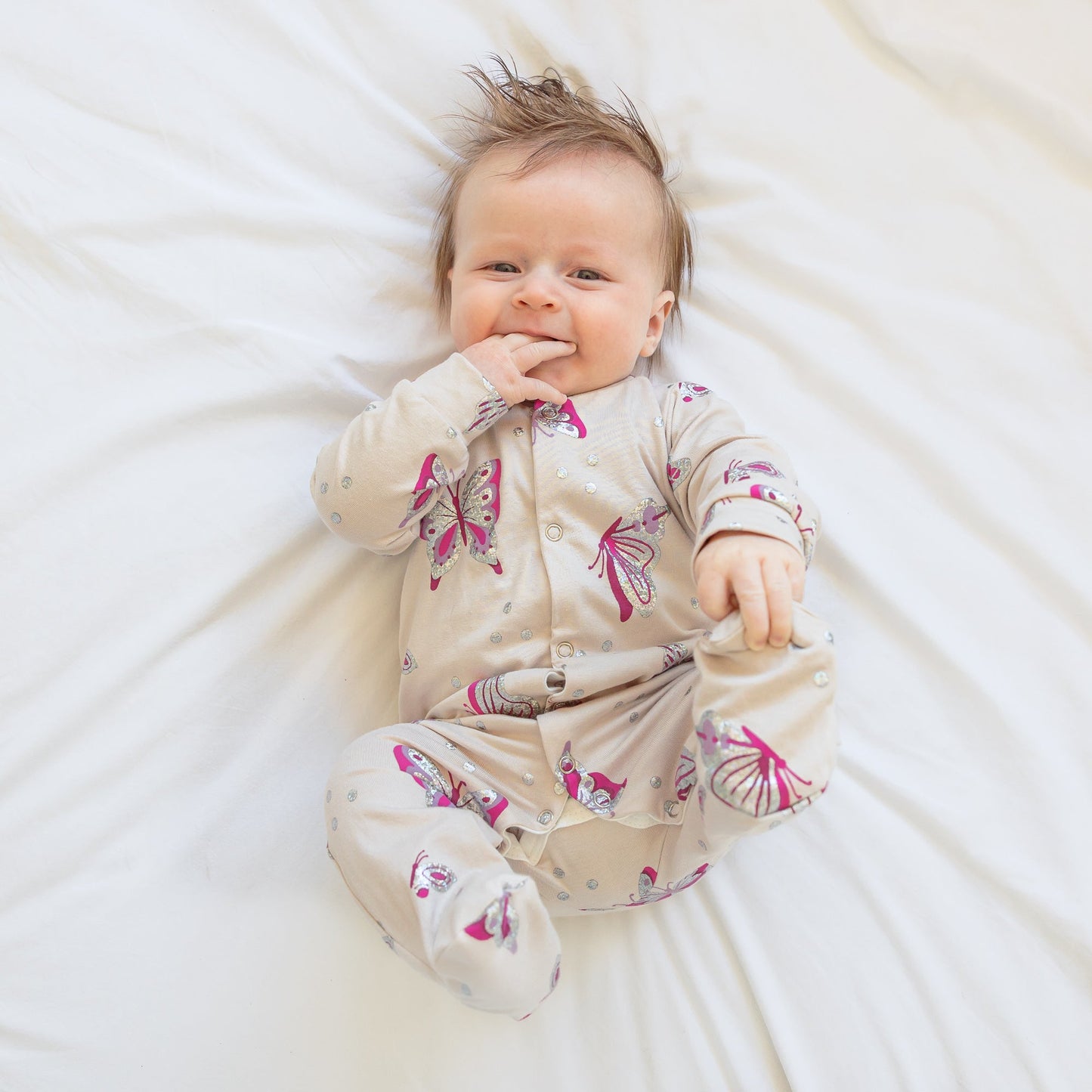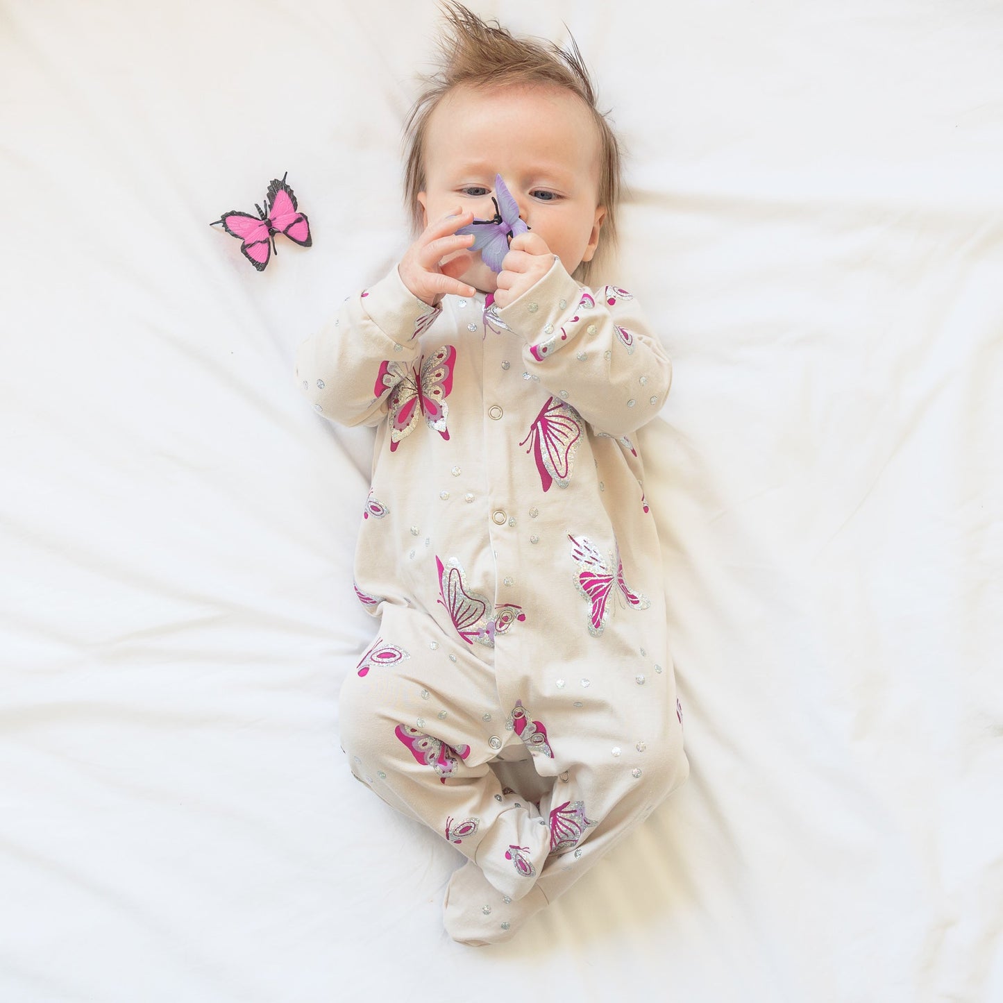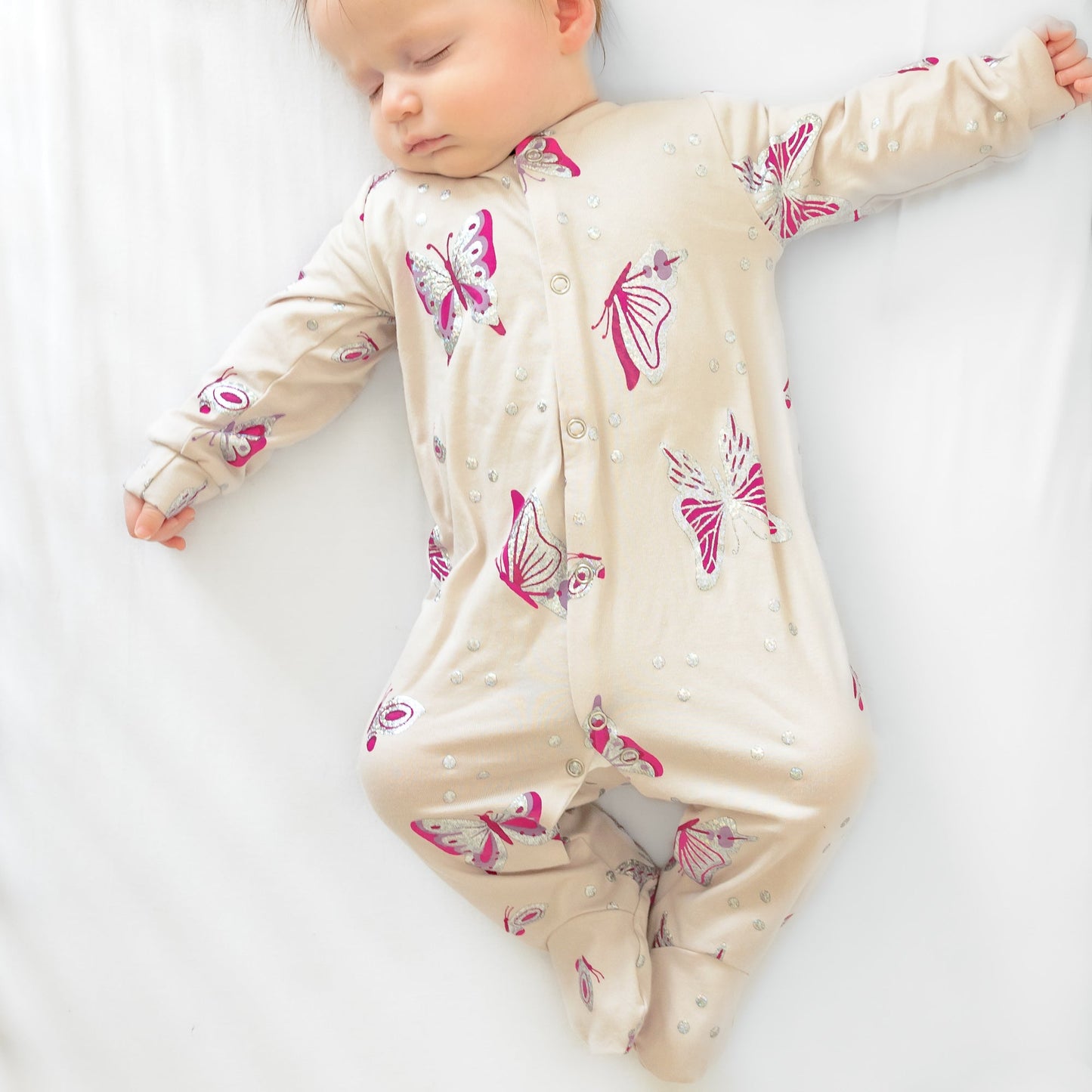 Our new and gorgeous Butterfly print sleep suit is the perfect one-piece for any baby.